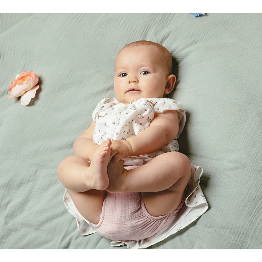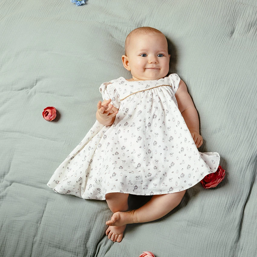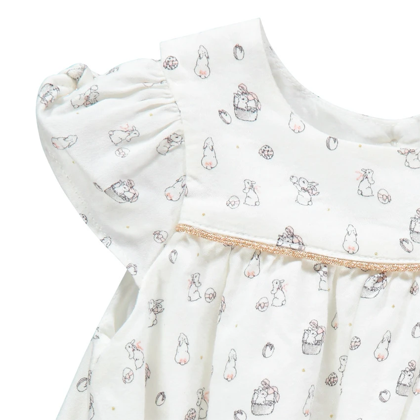 Robe à manches volantées. Lapins printés all-over. Bloomer en maille gaufrée. Taille élastiquée.