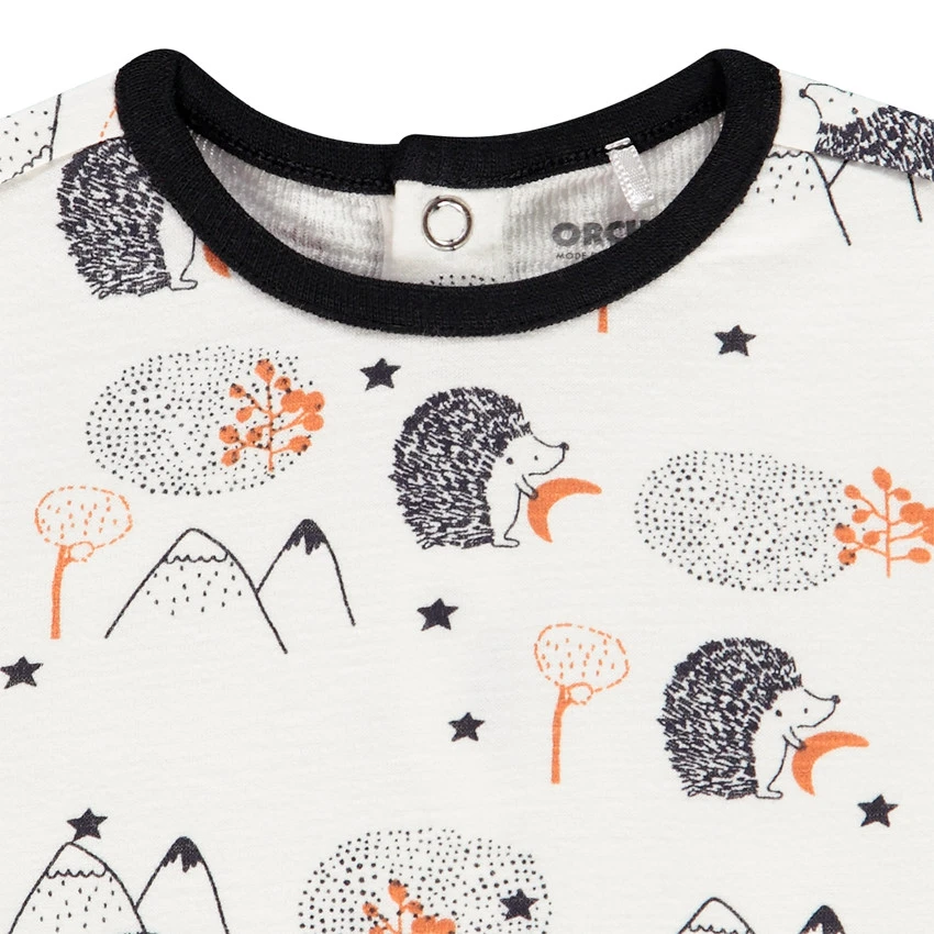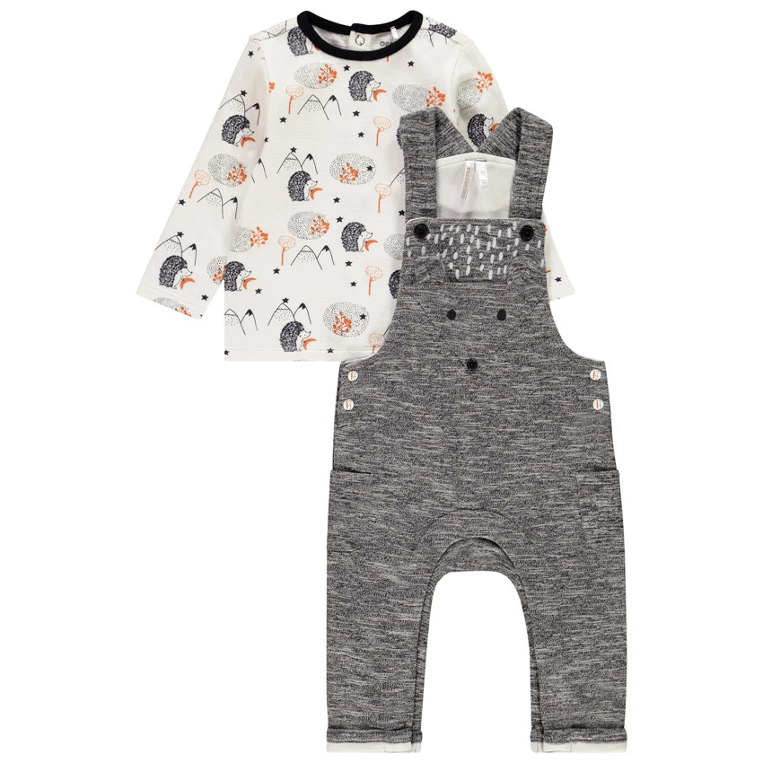 Salopette chinée pour bébé garçon. Bretelles ajustables. Print et poche forme hérisson. Ouvertures pressionnées sur les côtés. Entrejambe pressionné. Revers fixes. 2 poches sur les côtés.