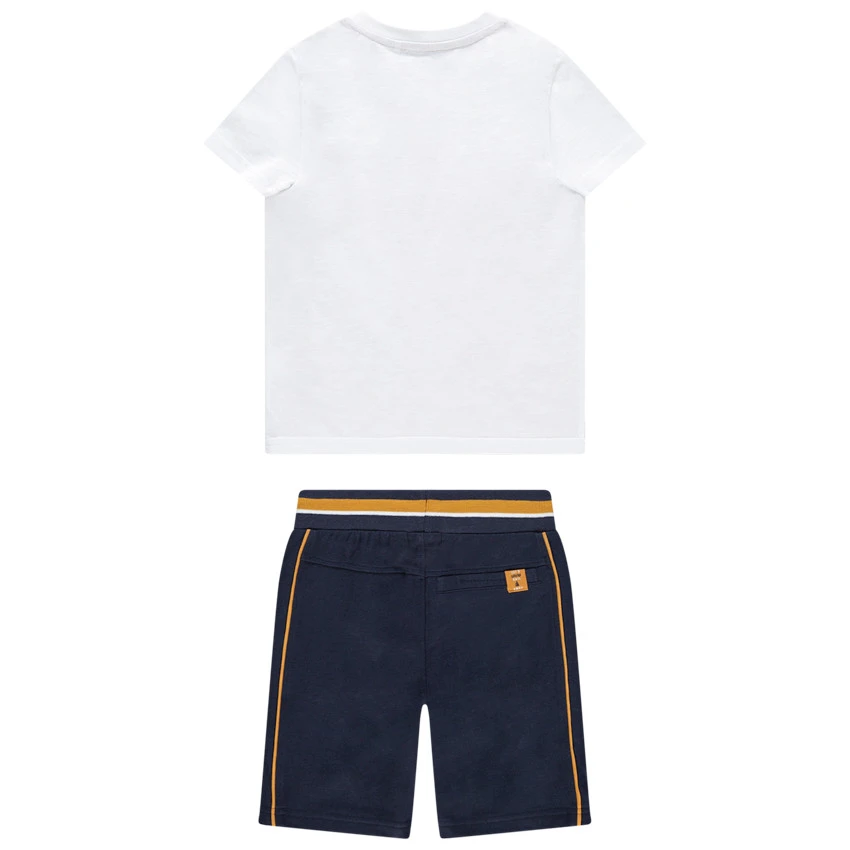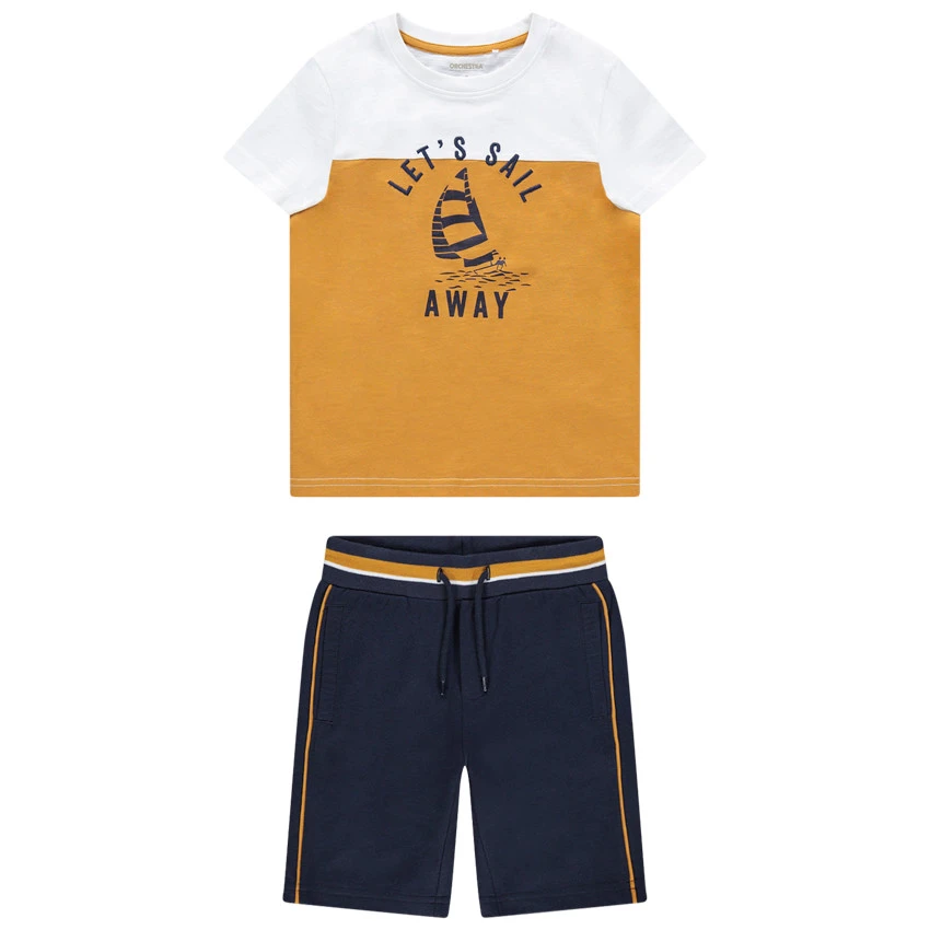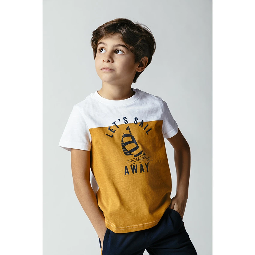 T-shirt manches courtes bicolore. Encolure ronde en bord-côte. Bateau printé et texte brodé.