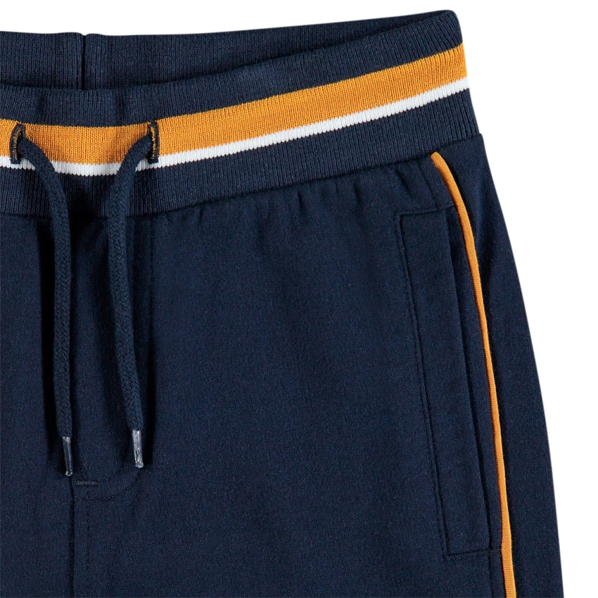 Bermuda en maille. Taille élastiquée en bord-côte à cordons de serrage. 2 poches passepoilées sur le devant. Biais contrastés sur les jambes.