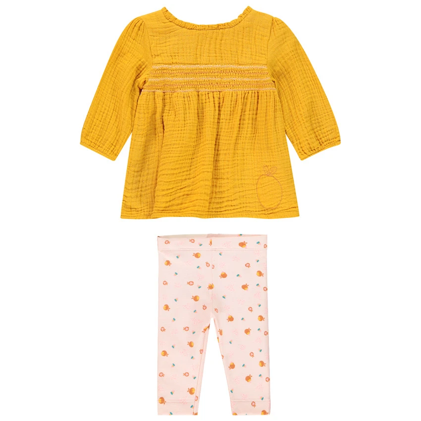 Tunique en gaze de coton pour bébé fille. Fronces et surpiqûres sur le devant. Pomme brodée.