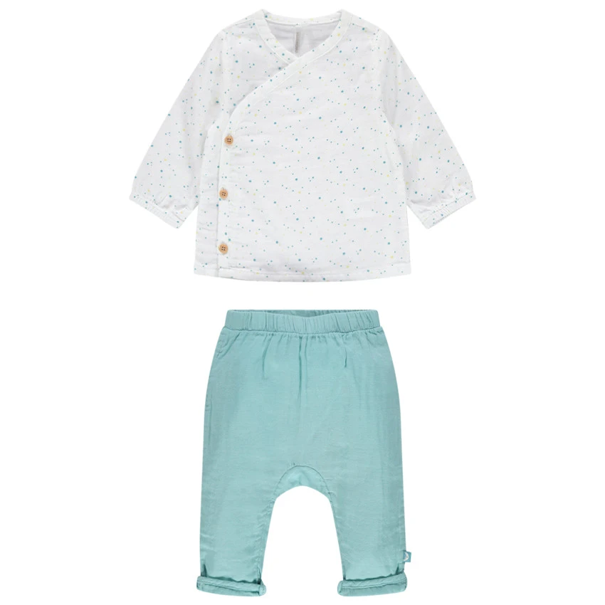 Pantalon uni en coton bio. Taille élastiquée. Fourche basse.