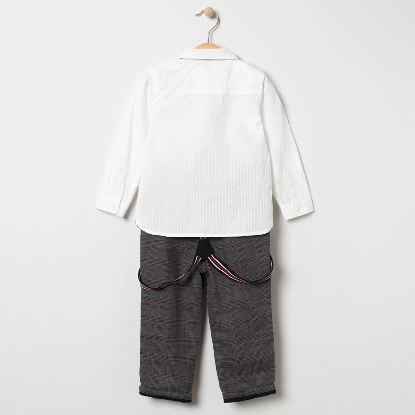 Chemise manches longues à rayures verticales. Col chemise. Ouverture boutonnée devant. Cravate à carreaux amovible par scratch. Poignets boutonnés.
