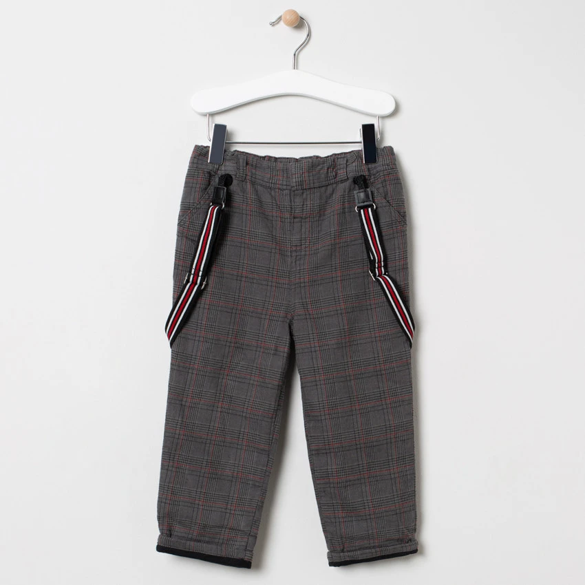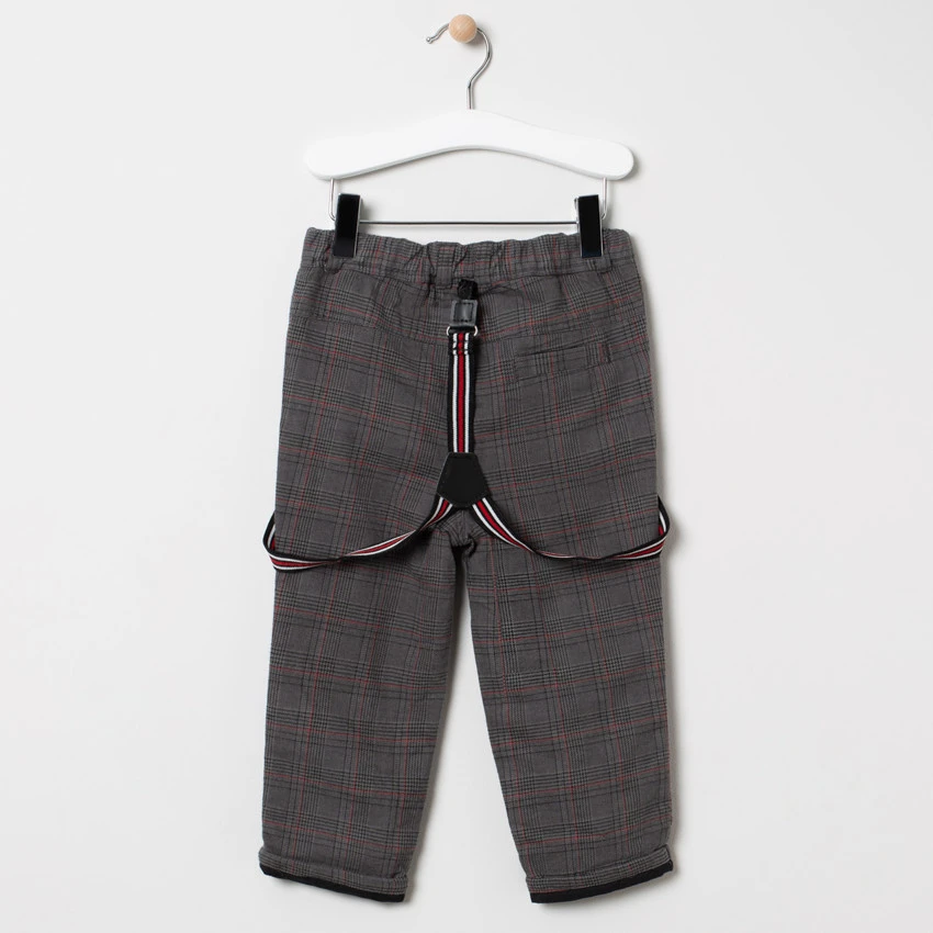 Pantalon à carreaux Prince de Galles doublé. Taille à passants ajustable de l’intérieur par élastique et boutons. Bretelles élastiquées amovibles. 1 poche passepoilée au dos.