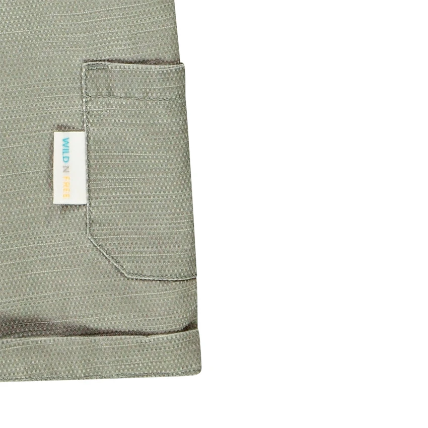 Bermuda uni. Taille élastiquée. Ouverture boutonnée sur le devant. Deux poches cavalière et deux poches plaquées dont une avec étiquette sur le devant.