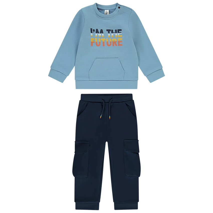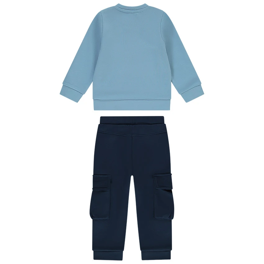 Ensemble de jogging. Sweat printé sur le devant. Encolure ronde. Ouverture pressionnée sur l’épaule. Poche kangourou sur le devant. Pantalon de jogging. Taille élastiquée. Cordon de serrage. 2 poches cargos. 2 poches droites sur le devant. Chevilles resserrées.