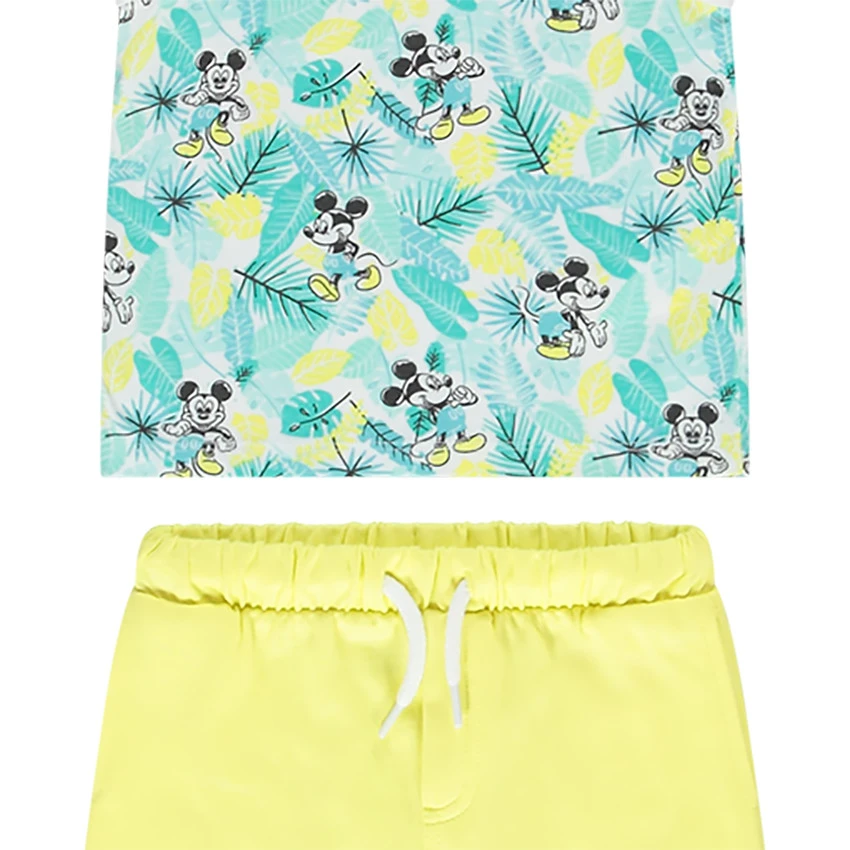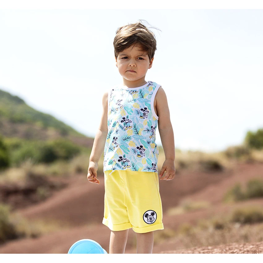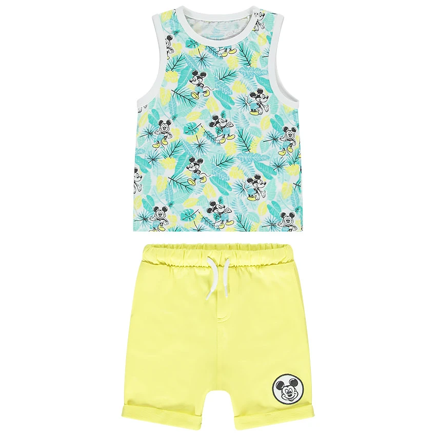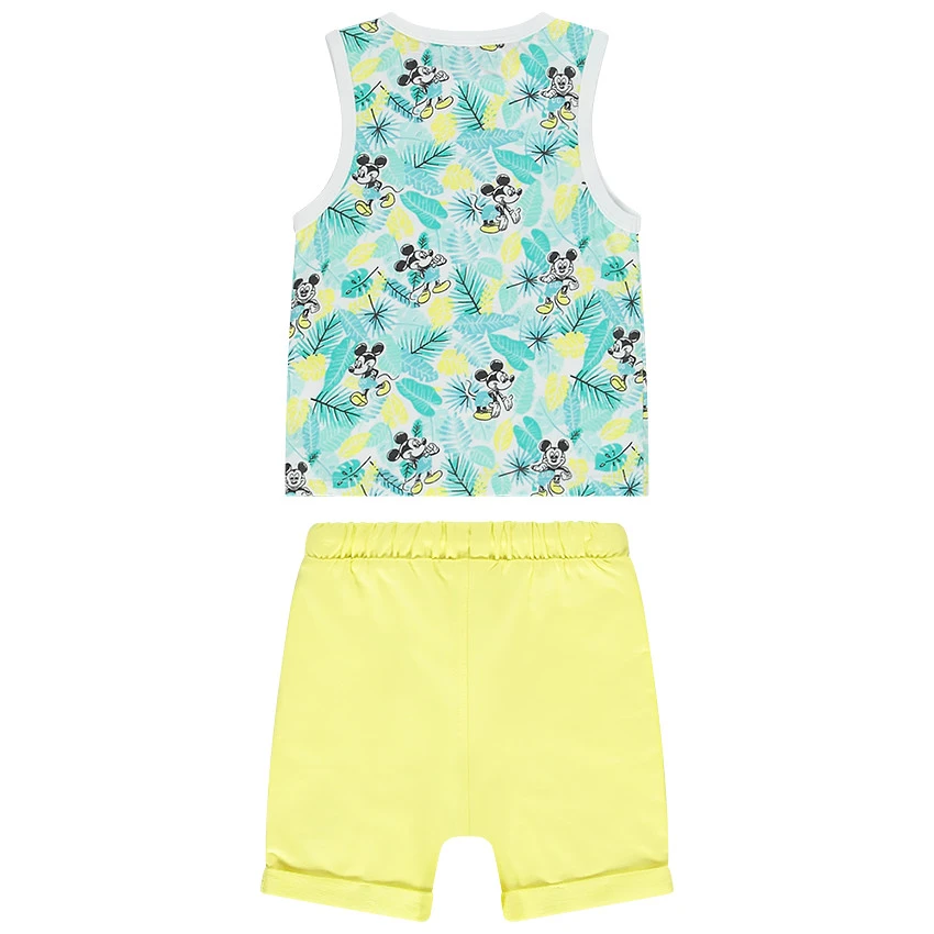 Ensemble de plage en jersey. Débardeur imprimé Mickey Disney. Col rond. Encolure et emmanchures en bord-côtes. Bermuda uni. Taille élastiquée. Cordon de serrage. 2 poches droites. Revers fixes. Broderie Mickey Disney.