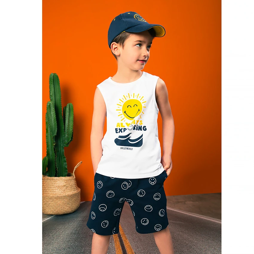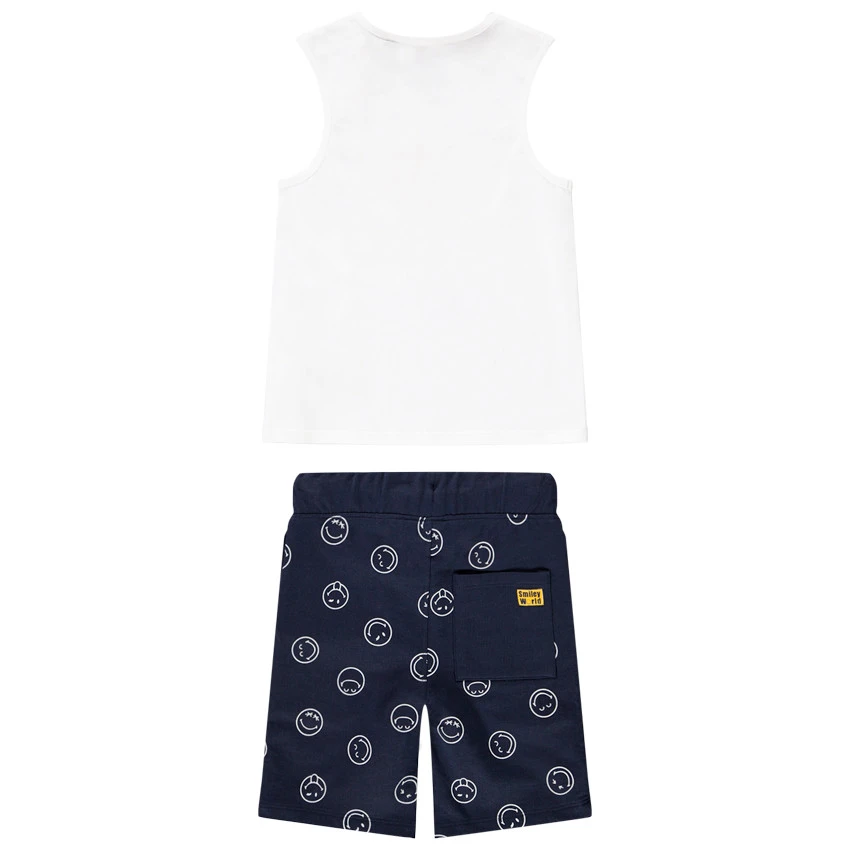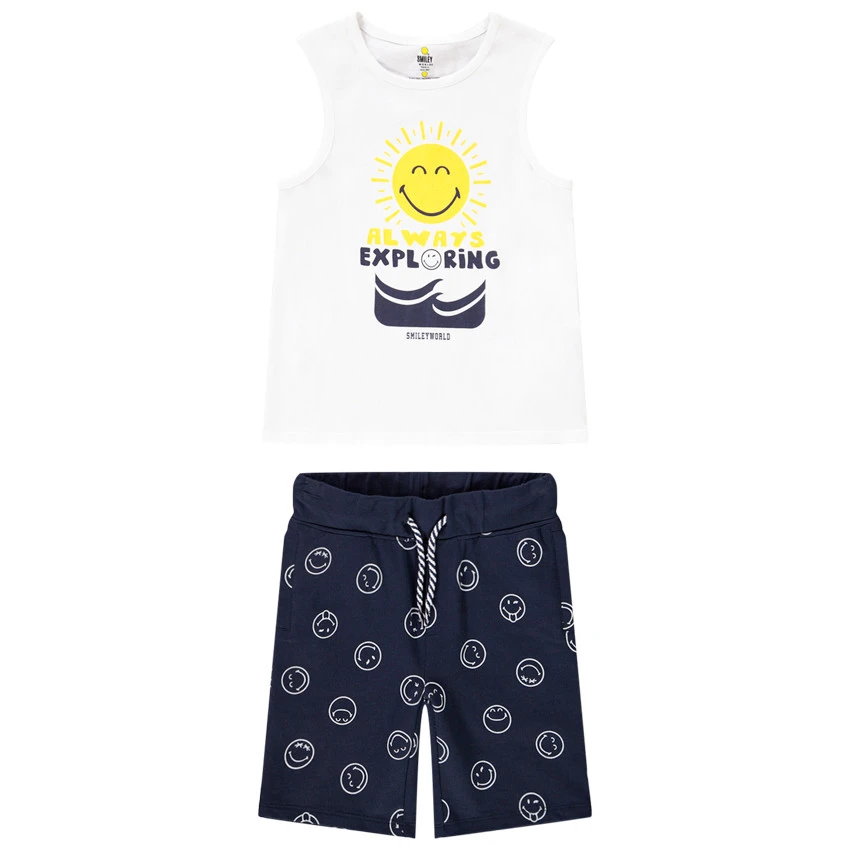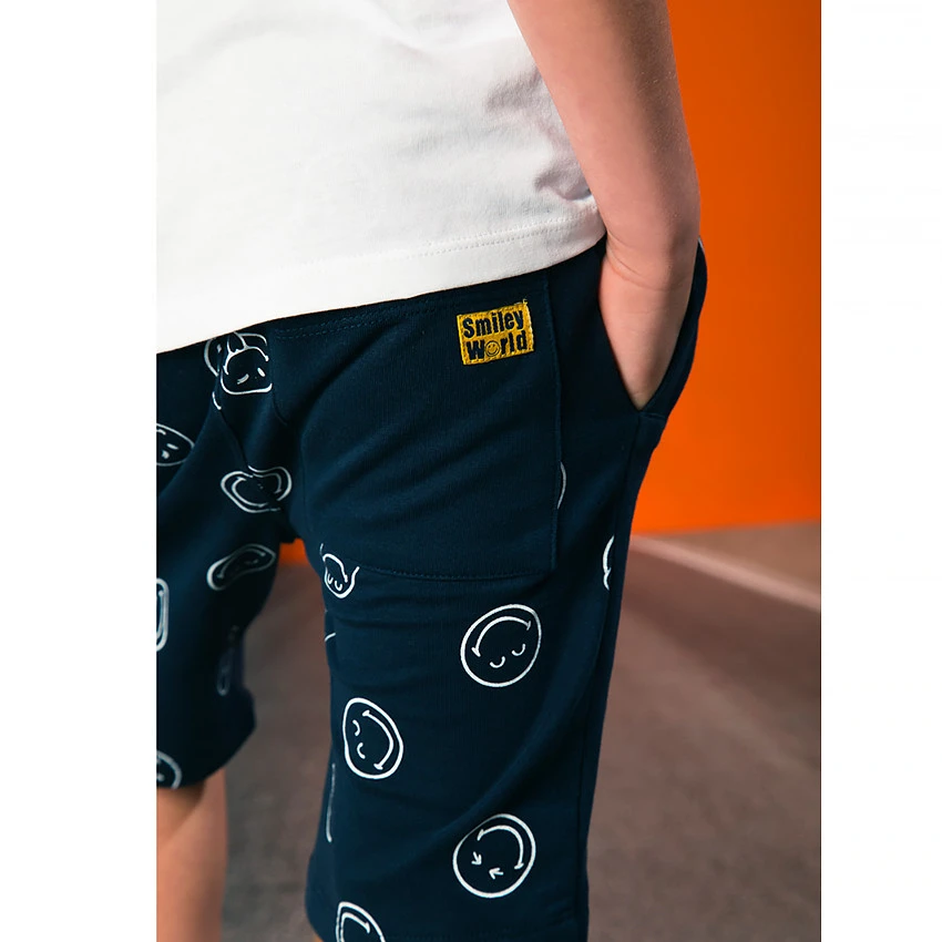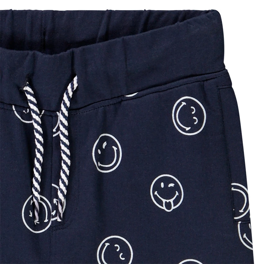 Short. Taille élastiquée. Cordon de serrage contrasté et rayé. Imprimé Smiley all-over. Une poche plaquée unie avec étiquette contrastée.