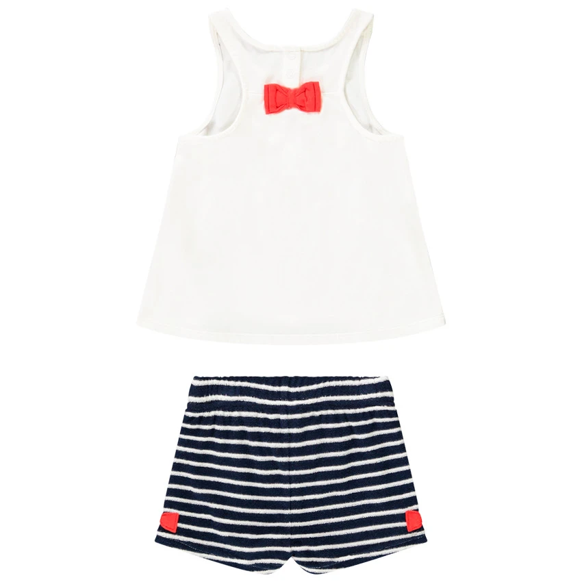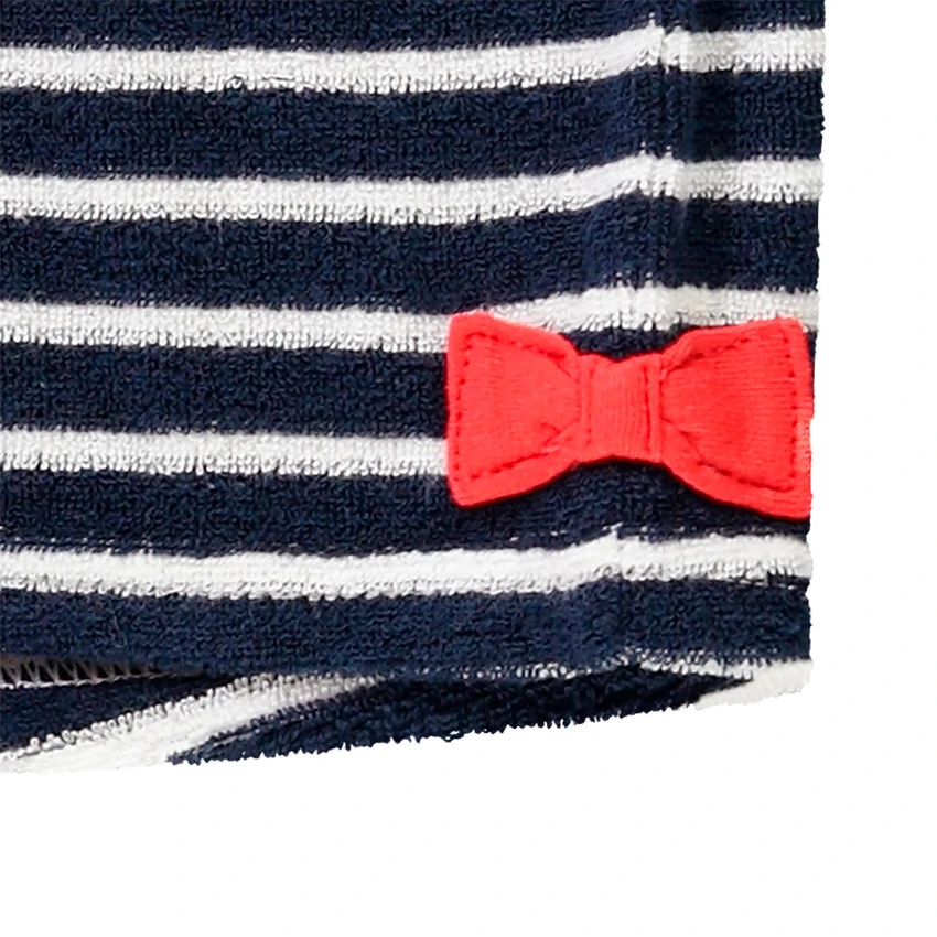 Short en éponge. Taille élastiquée. Rayures all-over. Noeuds fantaisie contrastés sur les côtés.