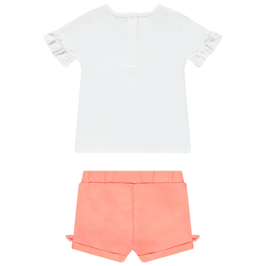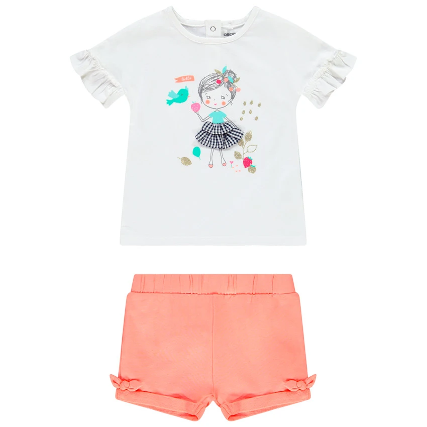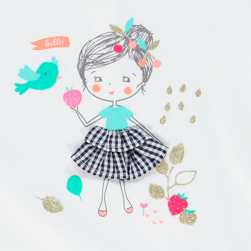 T-shirt. Encolure ronde. Manches courtes volantées. Print sur le devant avec détails brillants et en relief. Ouverture pressionnée à l’arrière.