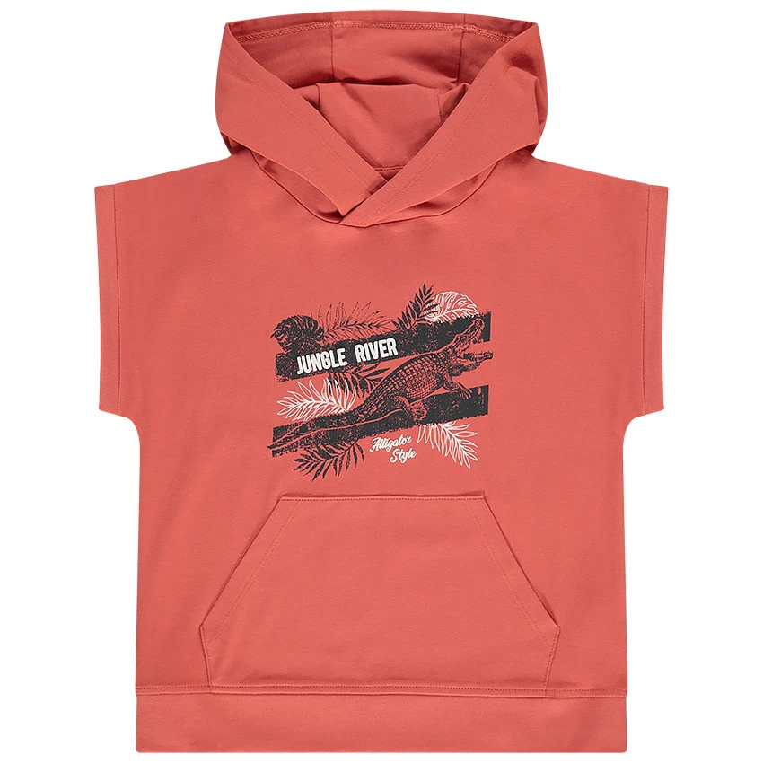 Ensemble de plage en jersey. Sweat à capuche rouge. Manches courtes. Print fantaisie sur le devant. Poche kangourou. Manches et bas élastiqués. Short noir uni. Poche kangourou. Taille élastiquée. Cordon de serrage. Poche à l’arrière.