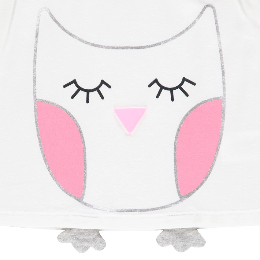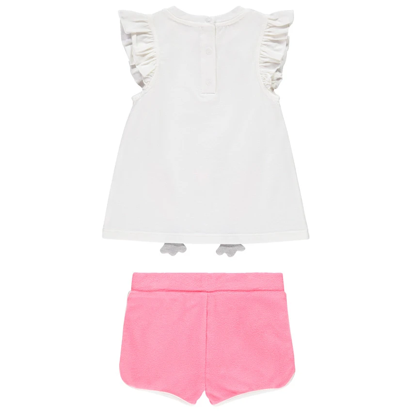 T-shirt à manches courtes volantées. Col rond en maille extensible. Ouverture pressionnée au dos. Hibou argenté printé devant. Pattes en relief. Short en éponge. Taille élastiquée pour un maximum de confort. Biais contrasté.