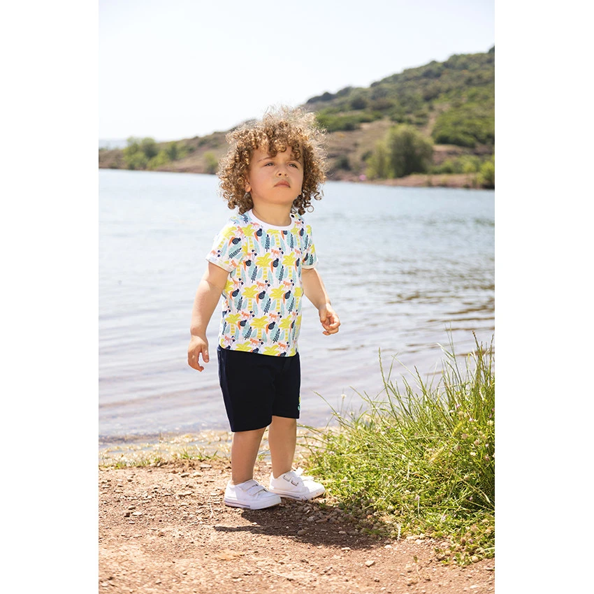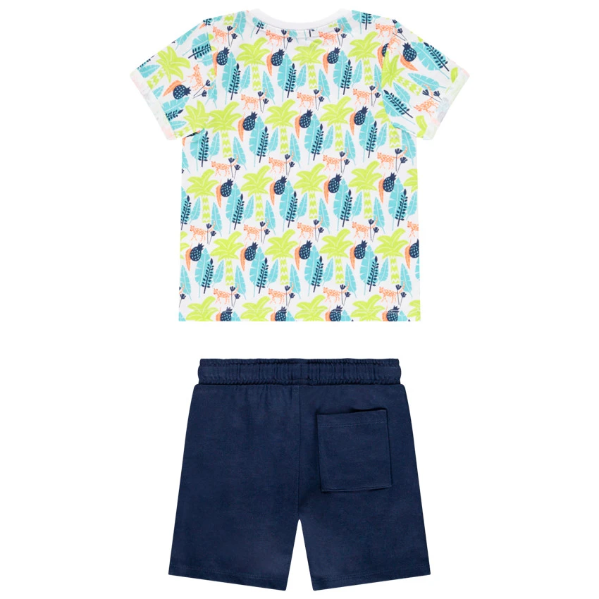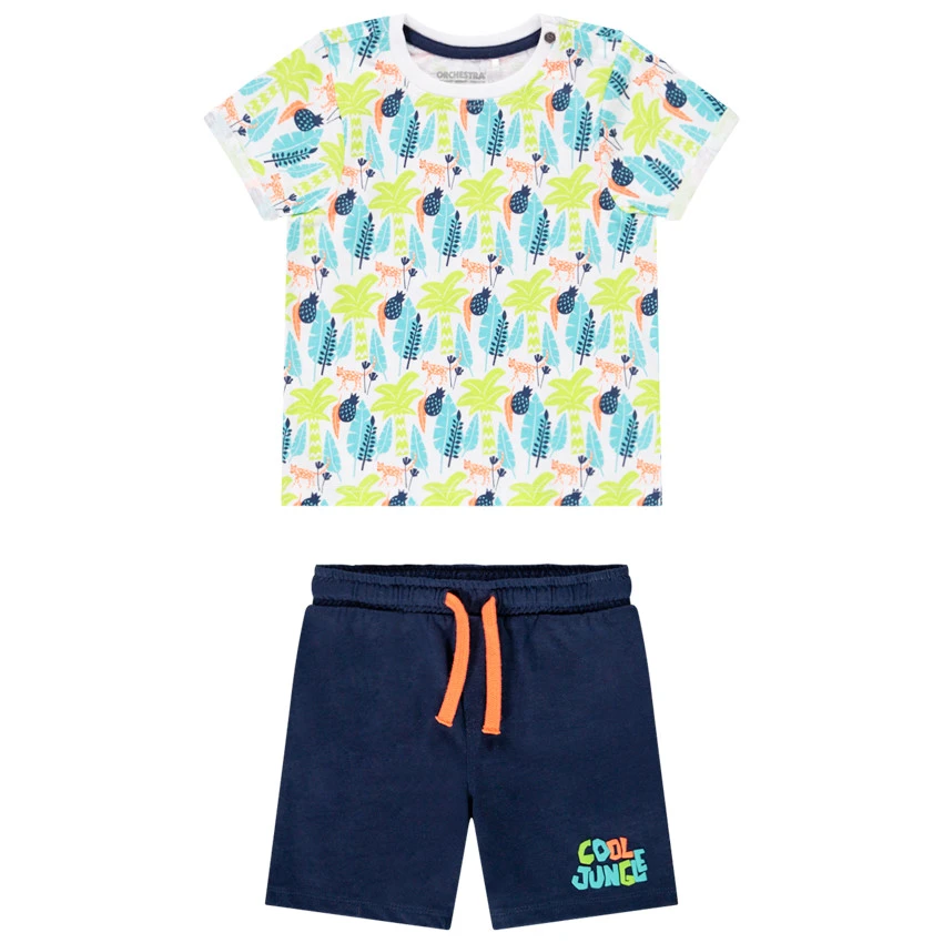 Ensemble de plage bleu marine. T-shirt blanc imprimé savane. Col rond. Bermuda uni. Taille élastiquée. Cordon de serrage. Inscription « cool jungle » sur le devant. Poche à l’arrière.