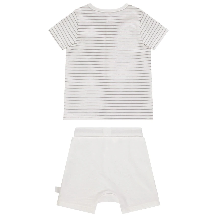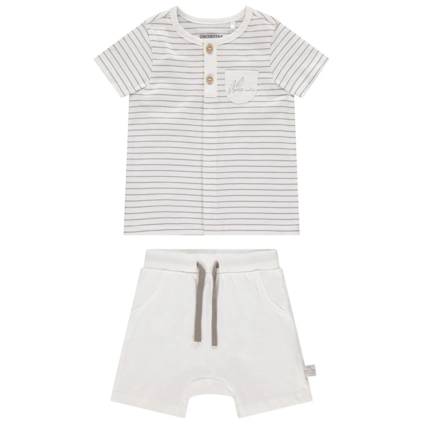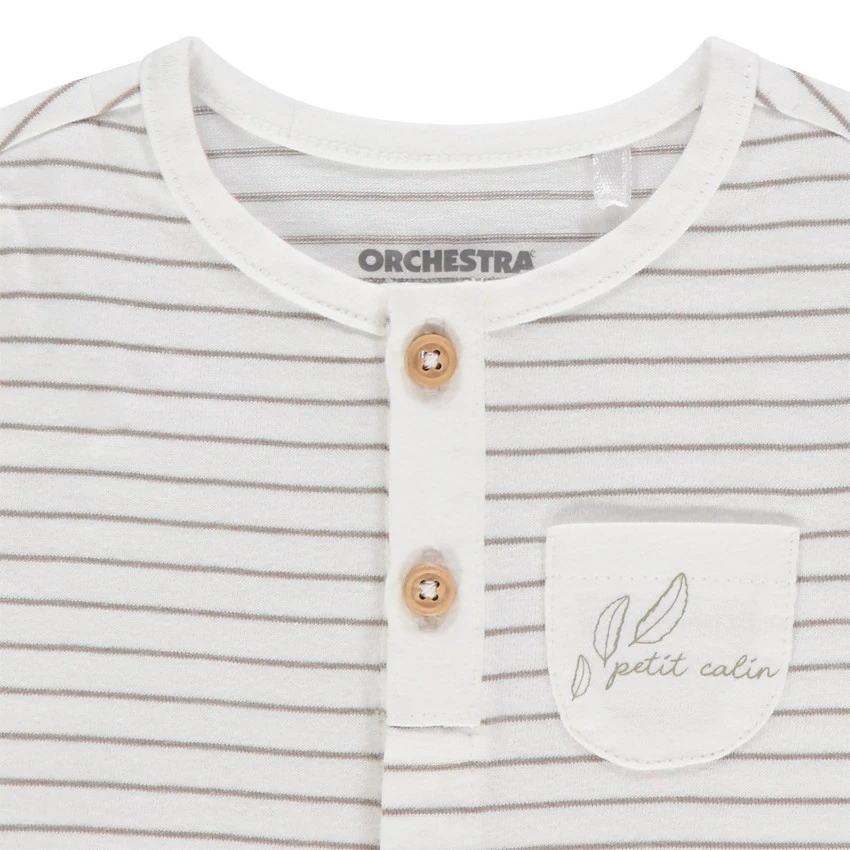 T-shirt manches courtes rayé all-over. Coton issu de l’agriculture biologique pour préserver la peau et l’environnement. Ouverture pressionnée devant avec 2 boutons. Encolure ronde en bord-côte. 1 poche plaquée sur la poitrine avec inscription brodée.