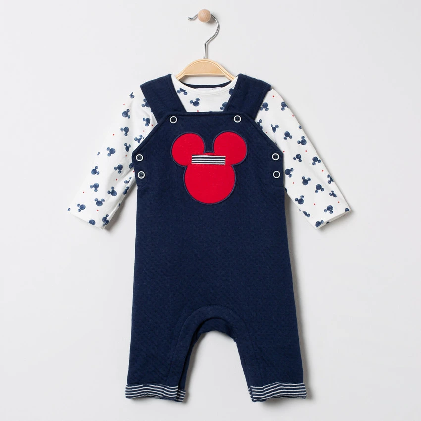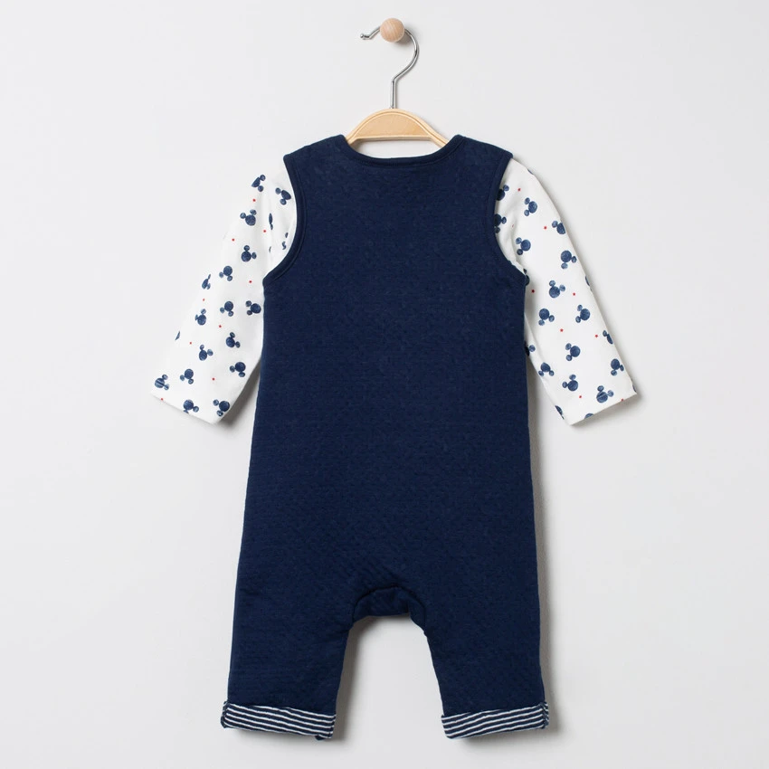 Salopette en maille fantaisie. Bretelles ajustables. Ouvertures boutonnées sur les côtés. Serti Mickey brodé devant. Entrejambe pressionné. Revers rayés.