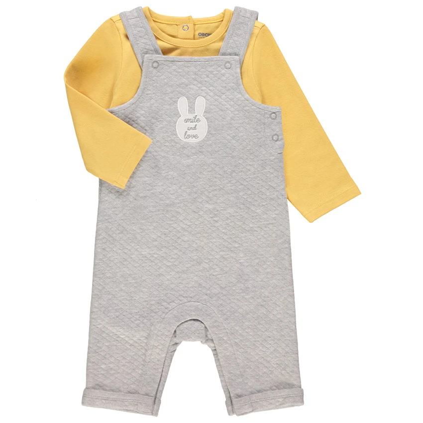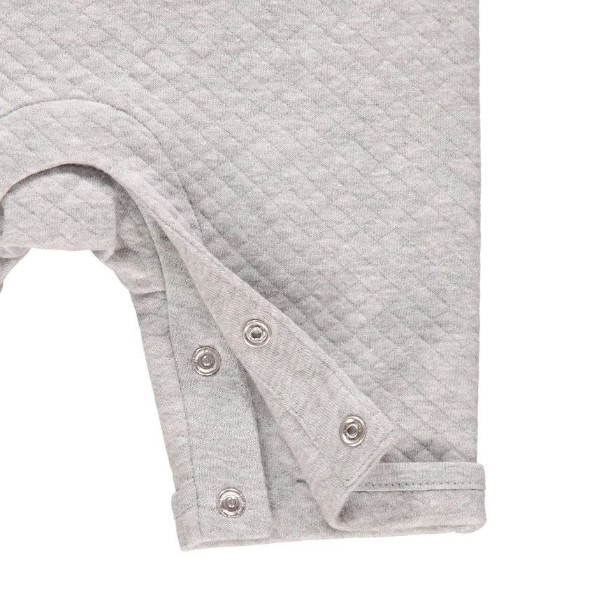 Salopette en maille fantaisie. Bretelles pressionnées ajustables. Lapin brodé sur la poitrine. Ouvertures pressionnées sur les côtés et à l’entrejambe. Revers fixes.