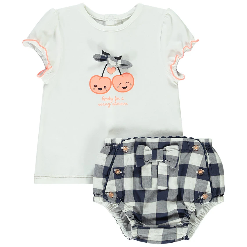 T-shirt encolure ronde en bord côte. Manches courtes avec emmanchures volantées et liseré contrasté. Print cerises et noeud fantaisie en relief sur le devant. Ouverture pressionnée dans le dos.