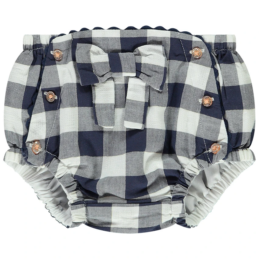 Bloomer avec taille et cuisses élastiquées. Noeud fantaisie sur le devant. Boutons contrastés sur les hanches. Liseré de finition ondulé. Imprimé carreaux Vichy all-over.