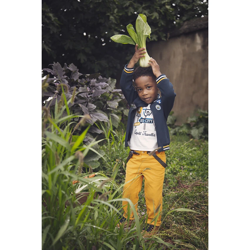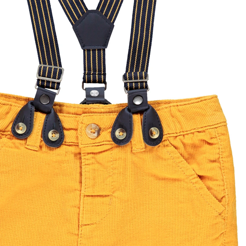 Pantalon en toile jaune. Taille ajustable de l’intérieur. Bretelles ajustables et amovibles. 2 poches italiennes devant. 2 poches au dos.