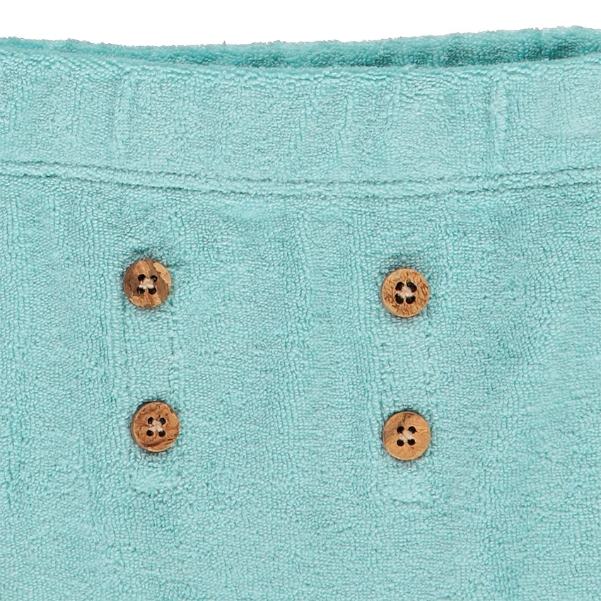 Bermuda en éponge avec boutons sur le devant. Taille et cuisses élastiquées.