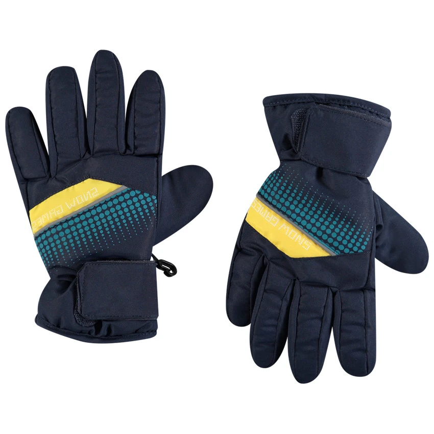 Gants de ski imperméables. Patte à scratch sur le poignet. Doublure en micropolaire. Imprimé graphique avec inscription sur le dessus. Paume antidérapante. Crochets pour relier les 2 gants.