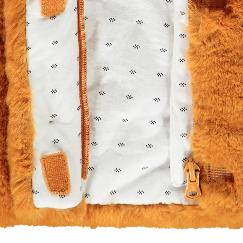 Gilet à capuche en sherpa. Oreilles en relief sur le sommet de la capuche. Doublure en jersey à coeurs all-over. Ouverture zippée devant.