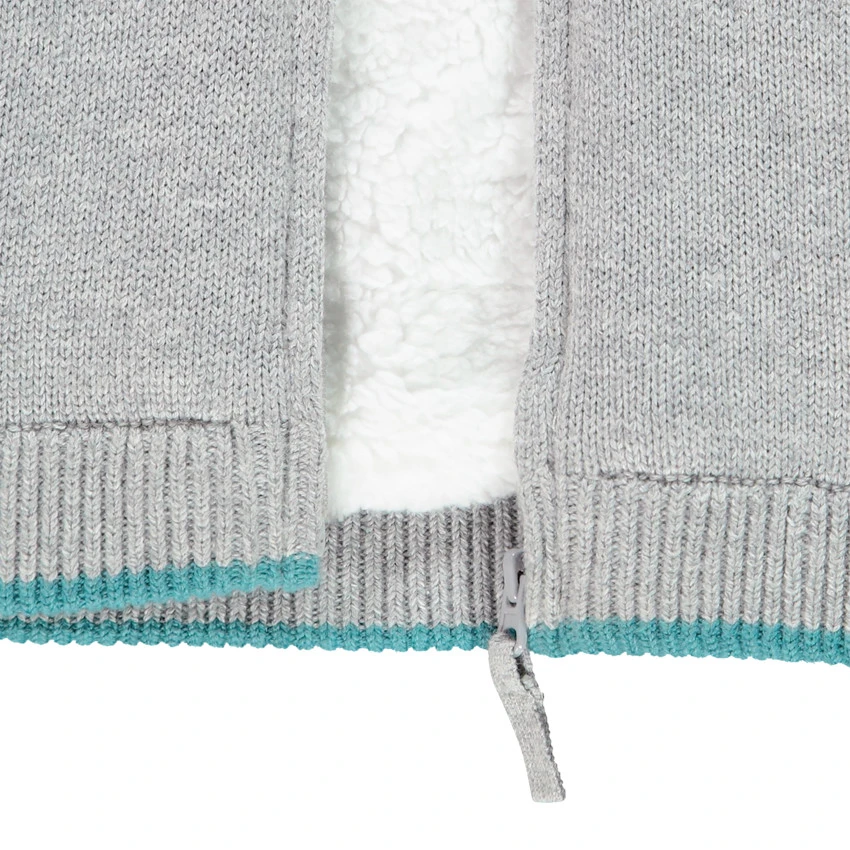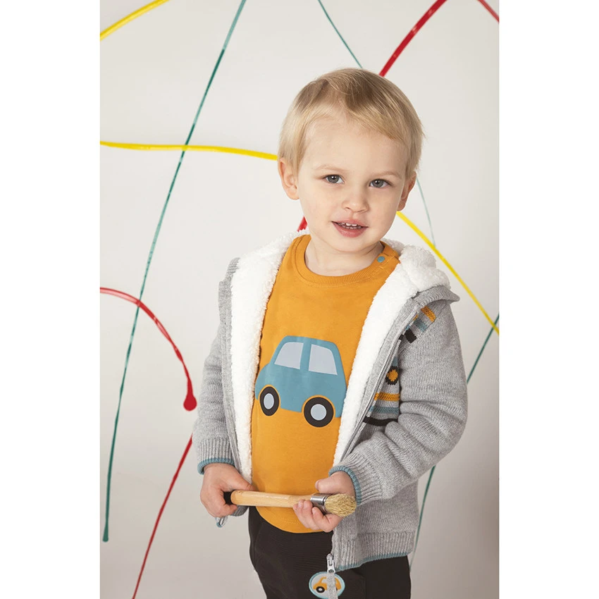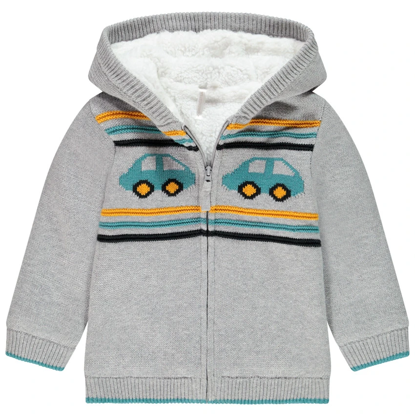 Gilet à capuche en tricot. Doublure en sherpa. Ouverture zippée sur le devant. Rayures et voitures en jacquard. Poignets et base en maille extensible.