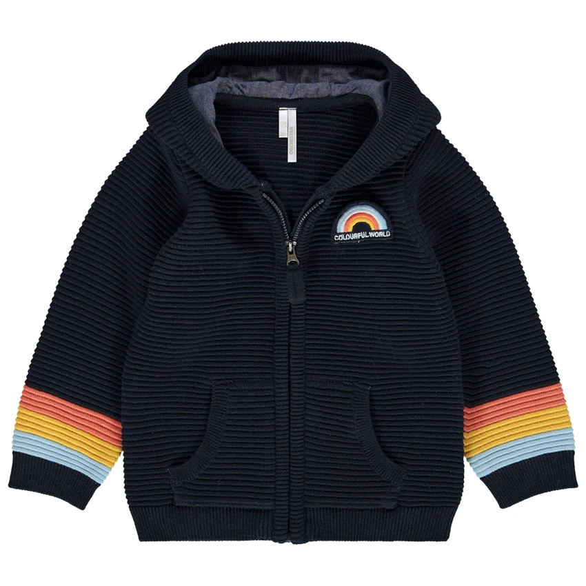 Gilet avec capuche. Empiècement brodé sur le devant. Bandes arc-en-ciel aux poignets. Ouverture zippée sur le devant.