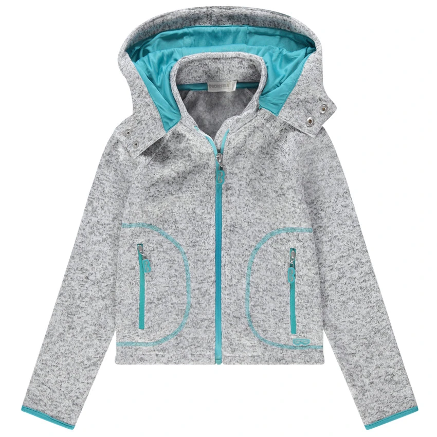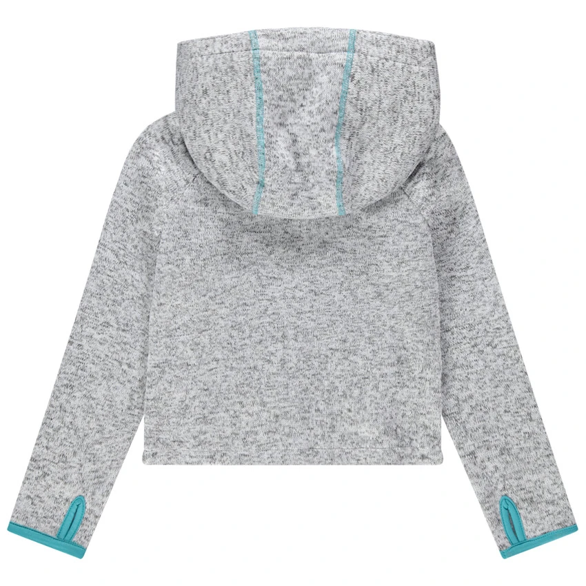 Gilet de ski à capuche en polaire chinée. Capuche enveloppante doublée jersey. Passage pour les pouces au bout des manches. 2 poches zippées devant. Surpiqûres contrastées.
