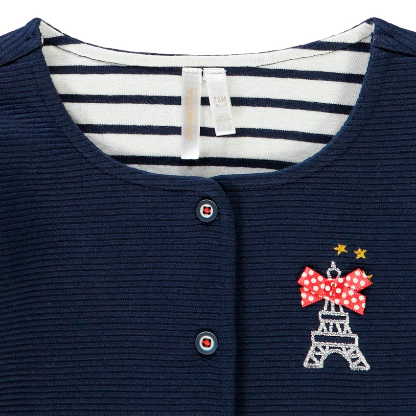 Gilet en maille. Col rond large. Ouverture boutonnée. Motif collé sur la poitrine. Noeuds cousus sur le bas du gilet. Intérieur à rayures.