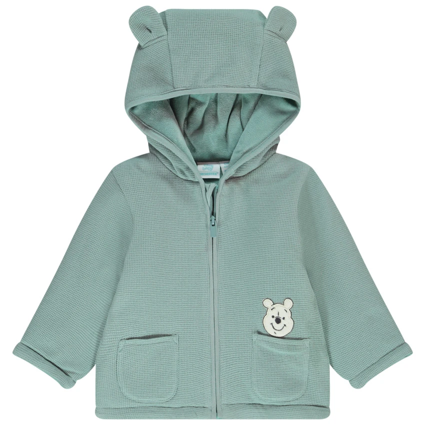 Gilet en maille nid d’abeille. Capuche avec oreilles en 3D. Ouverture zippée sur le devant. Manches longues avec surpiqûres aux poignets. Deux poches plaquées dont une avec patch brodé Winnie. Surpiqûre au niveau de la taille. Doublure en velours.