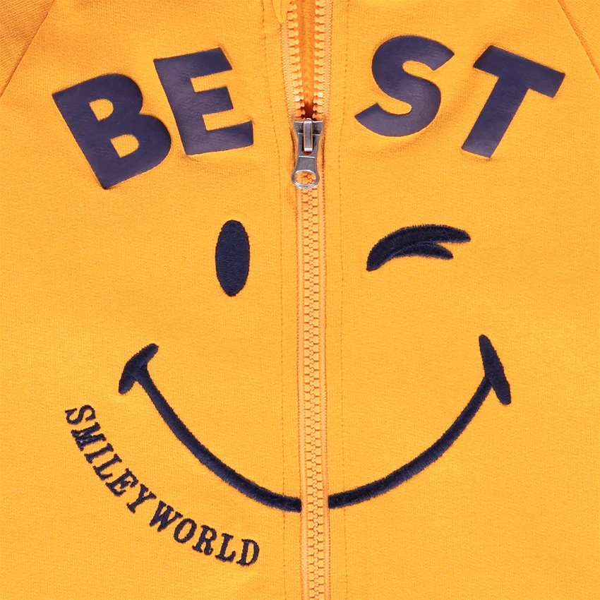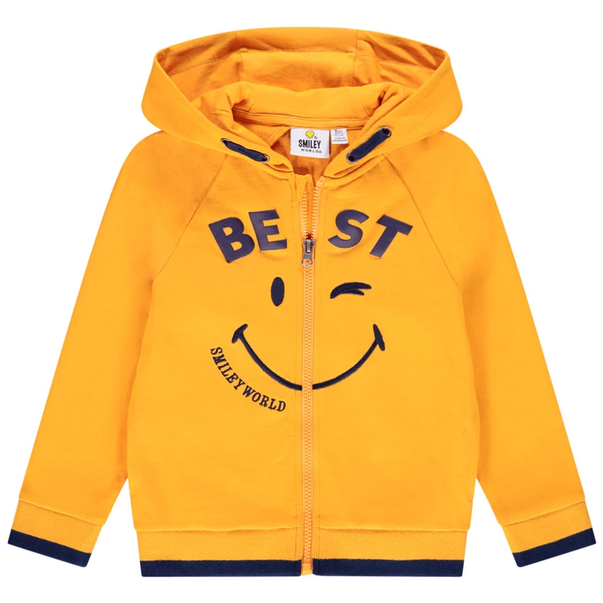 Gilet à capuche en molleton. Cordon de serrage au niveau de la capuche. Inscription et print SmileyWorld sur le devant. Ouverture zippée. Bas et poignets contrastés en bord-côte élastiqué.