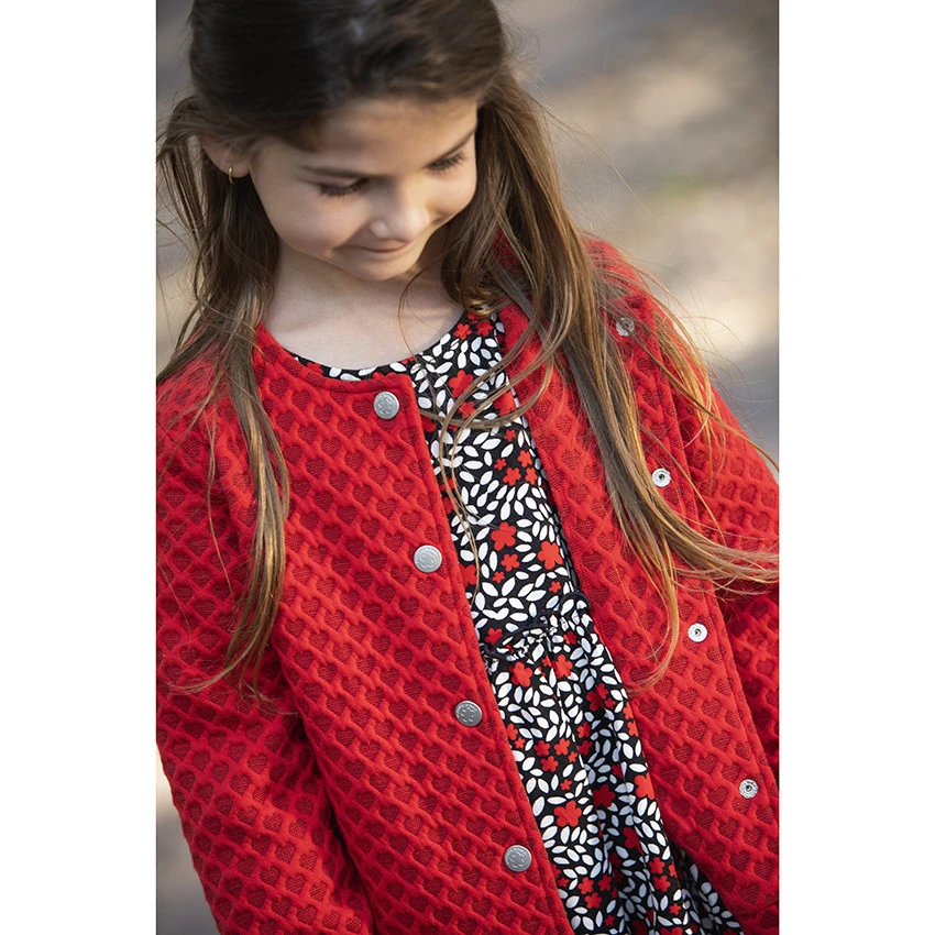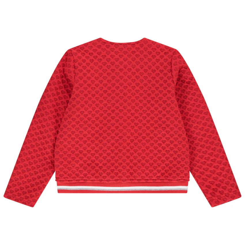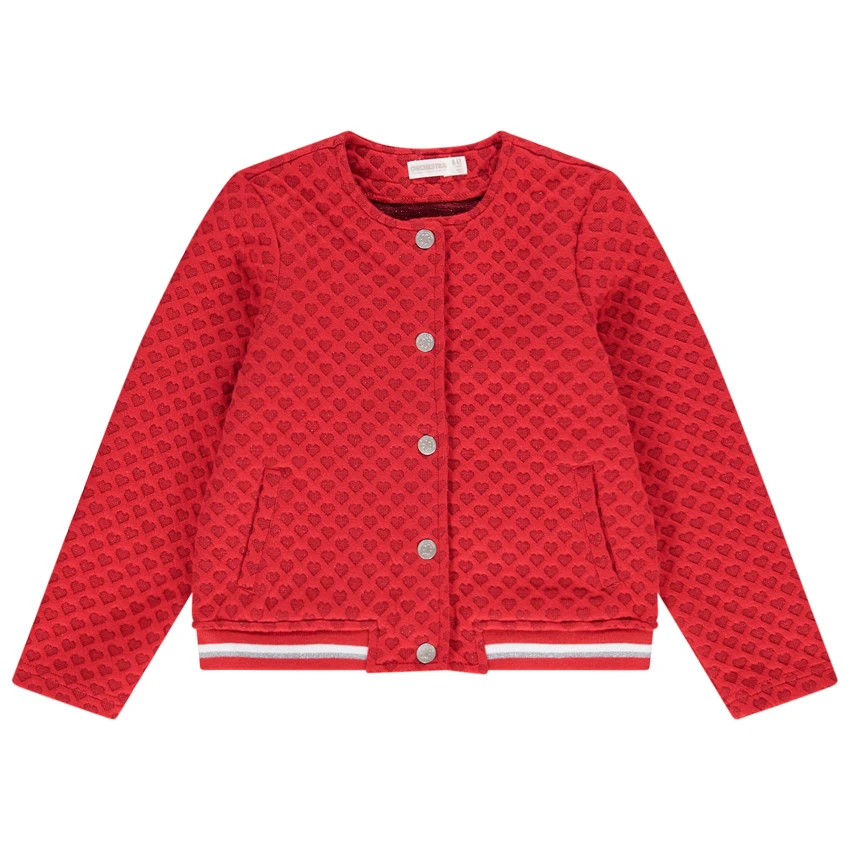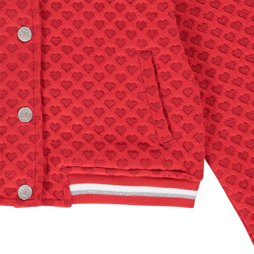 Gilet en molleton à coeurs en jacquard. Style teddy. Boutons gravés. Col rond. Ouverture pressionnée devant. 2 poches coupées devant. Base en bord-côte rayé avec rayure argentée.