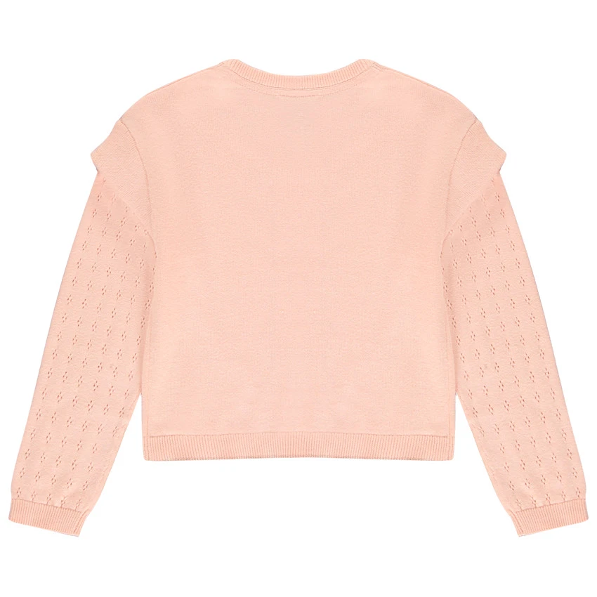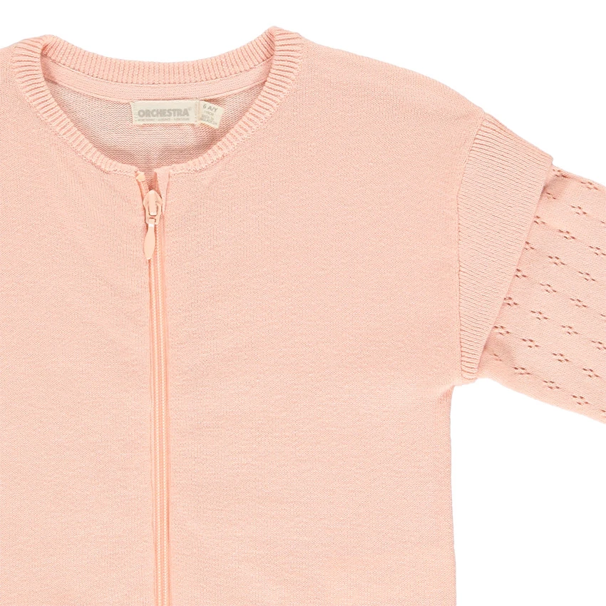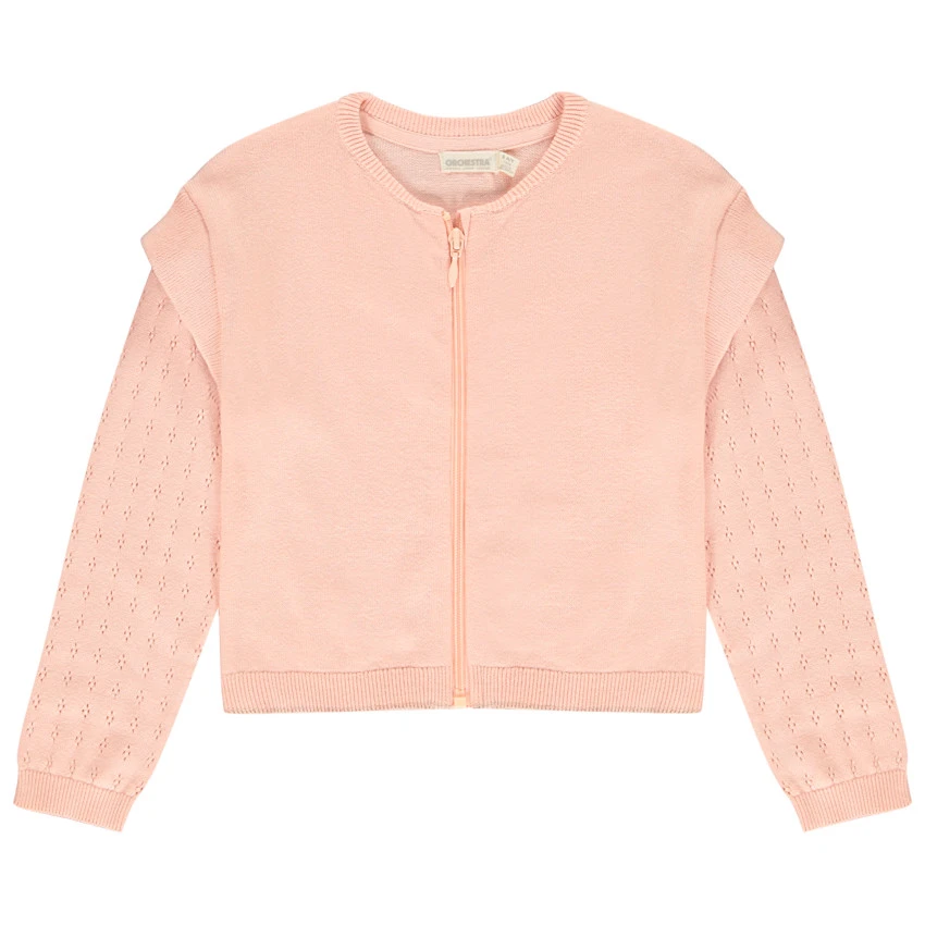 Gilet en tricot fin rose clair à manches longues ajourées. Effet de superposition sur les manches.Col rond en bord côte. Ouverture zippée sur toute la longueur. Poignets et base en bord côte.
