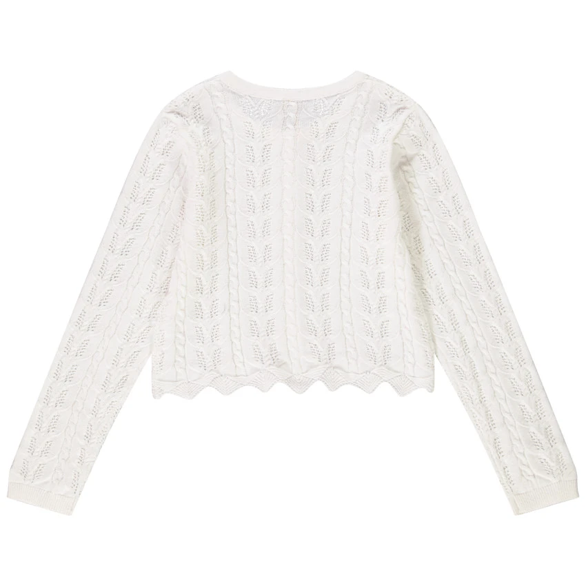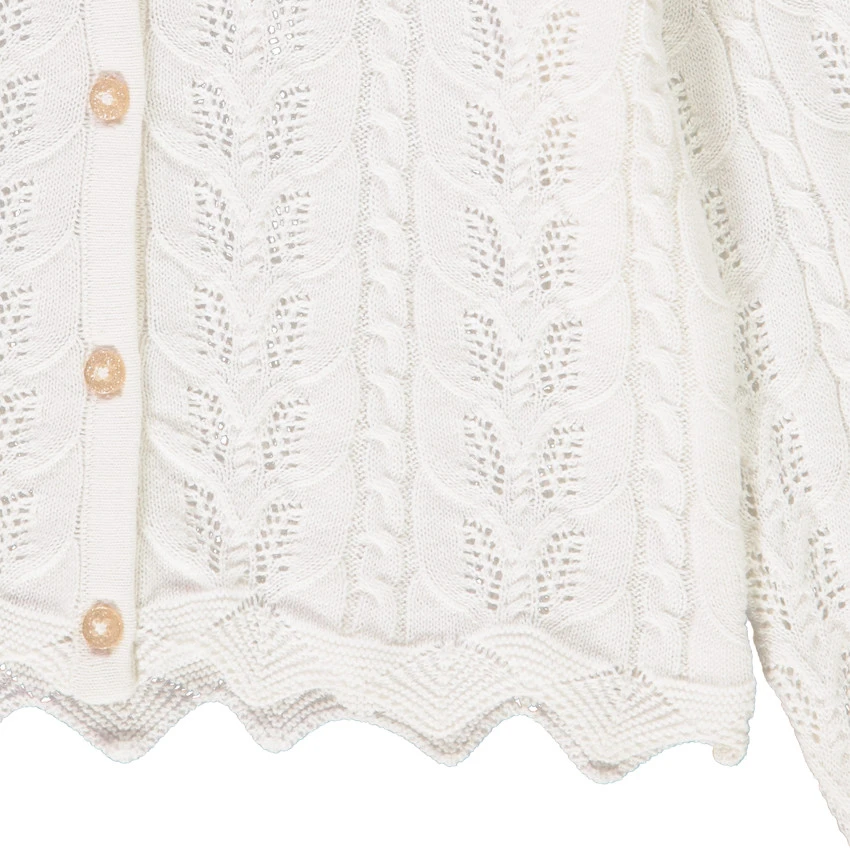 Gilet en tricot coloris écru. Mailles ajourées et torsadées. Encolure ronde. Ouverture boutonnée sur le devant. Manches longues. Base ajourée et ondulée à la taille.