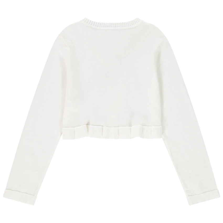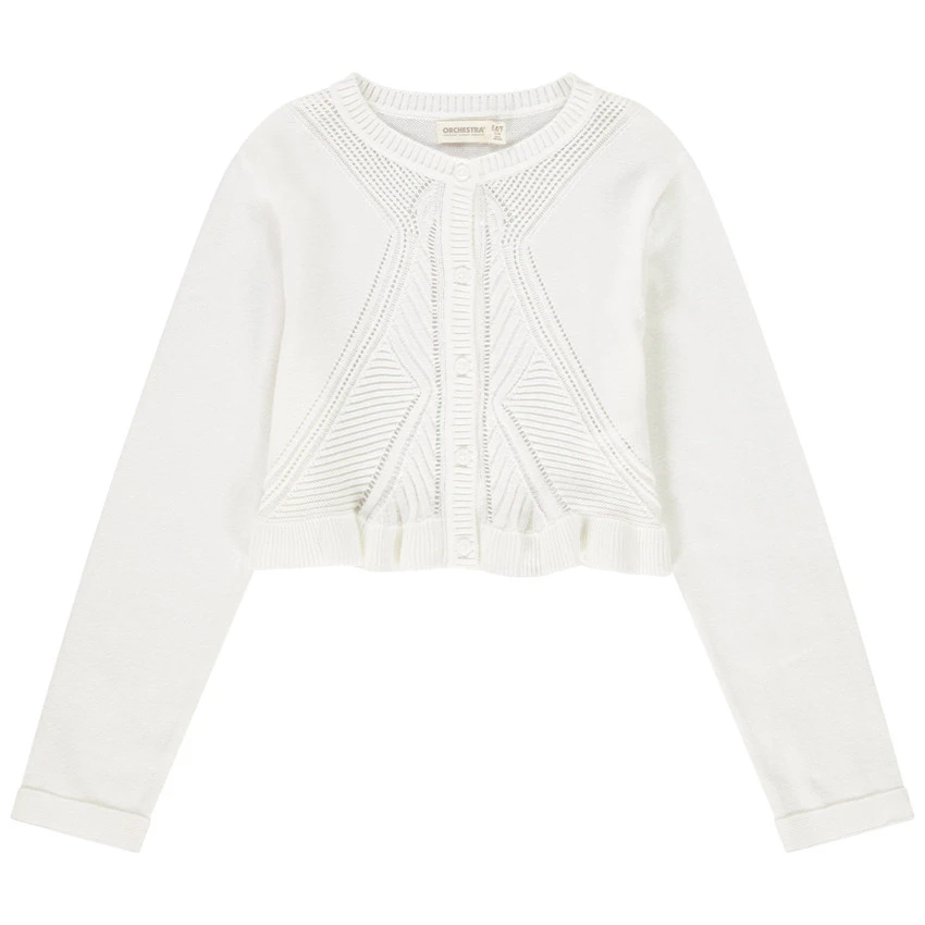 Gilet en tricot ajouré. Col rond. Ouverture boutonnée sur le devant. Base et poignets en bord côte.