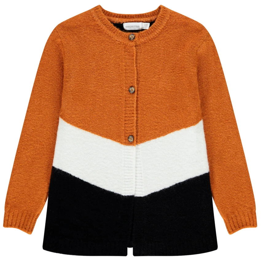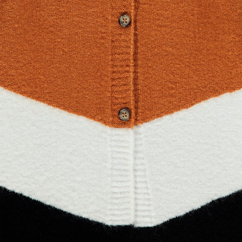 Gilet long en tricot contrasté. Col rond en maille extensible. Ouverture boutonnée sur le devant. Poignets et base en maille extensible. Dos uni.