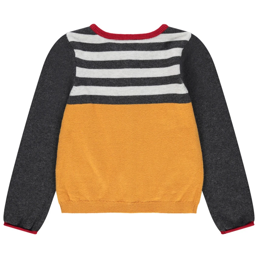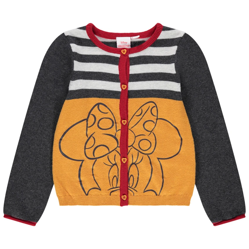 Gilet en tricot à rayures jacquard contrastées. Minnie printée sur le devant. Ouverture boutonnée avec boutons forme coeur. Finitions en bord-côte.