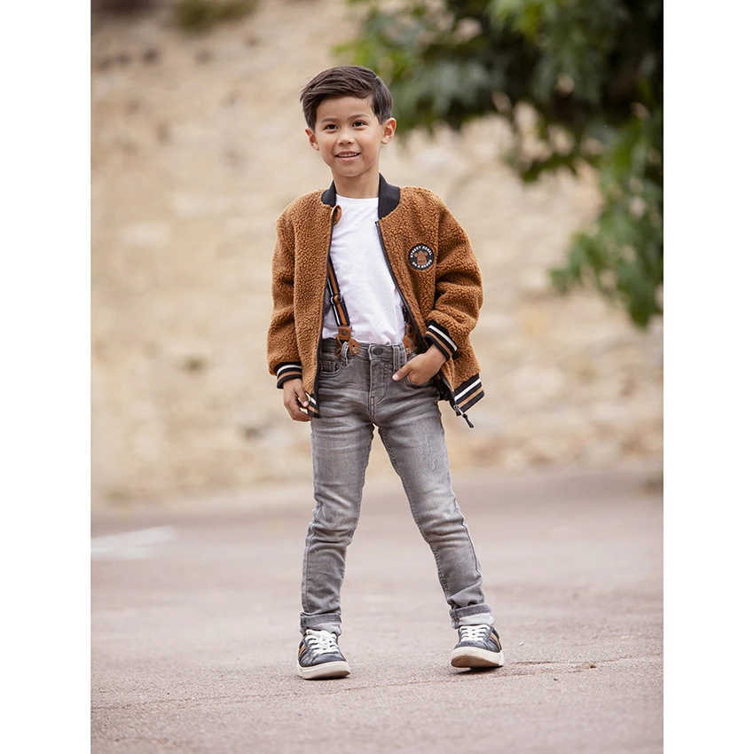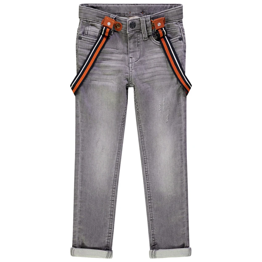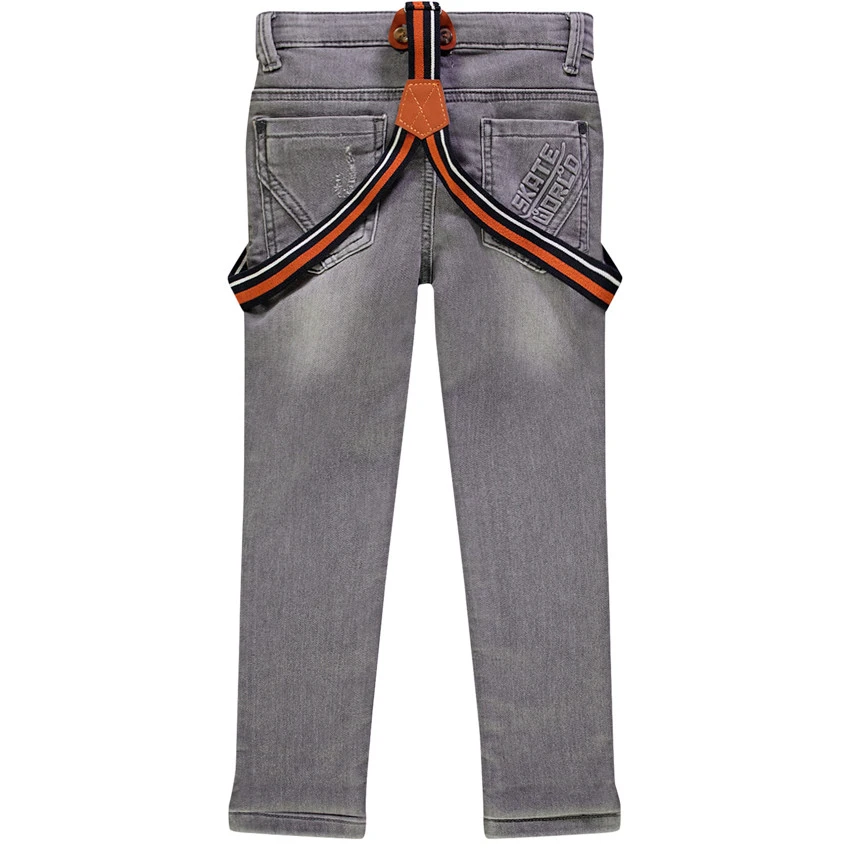 Jean effet délavé pour enfant garçon coupe slim. Taille à passants ajustable de l’intérieur pour l’adapter au mieux à la morphologie des petits garçons. Bretelles élastiquées amovibles par boutons. 2 poches cavalières et 1 poche ticket devant. 2 poches plaquées au dos avec inscription en relief sur celle de droite.