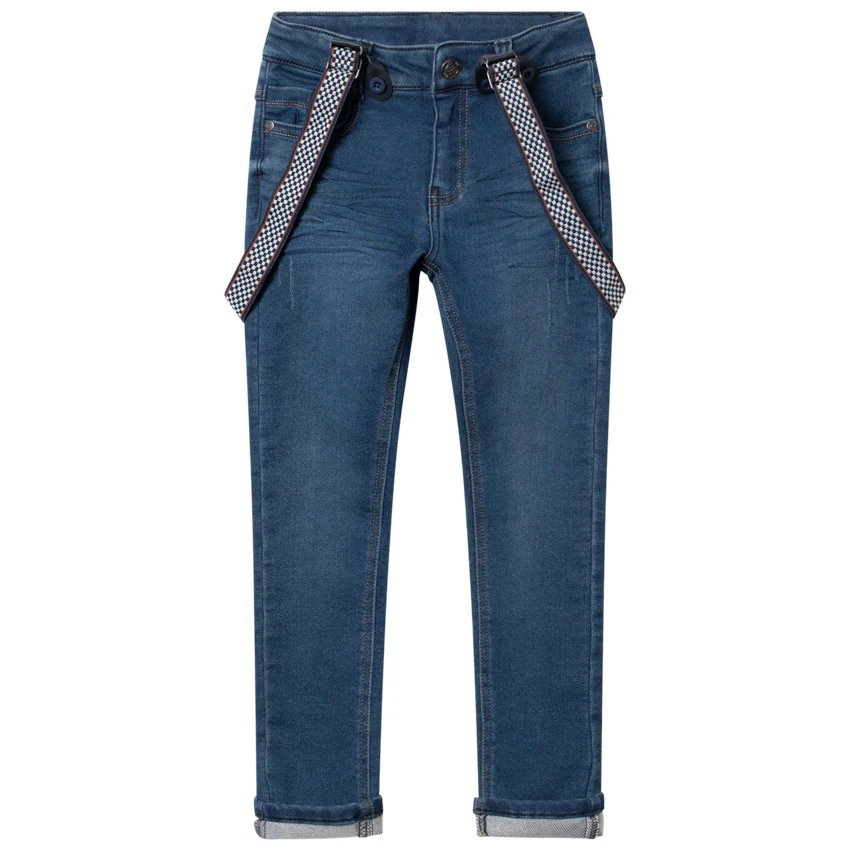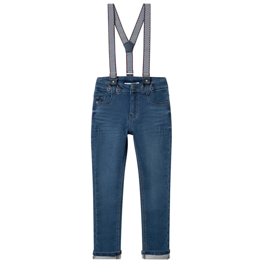 Jean effet used et crinkle. Ceinture à passants avec bouton et braguette zippée. 2 poches cavalières. 2 poches passepoilées au dos. Bretelles ajustables et amovibles.