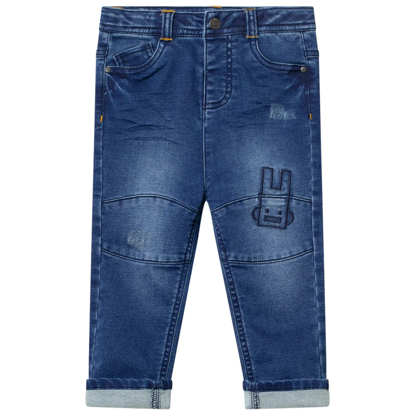 Jean effet used. Taille avec passants pour ceintures. 2 poches cavalières. Broderies contrastées. 2 poches plaquées au dos.