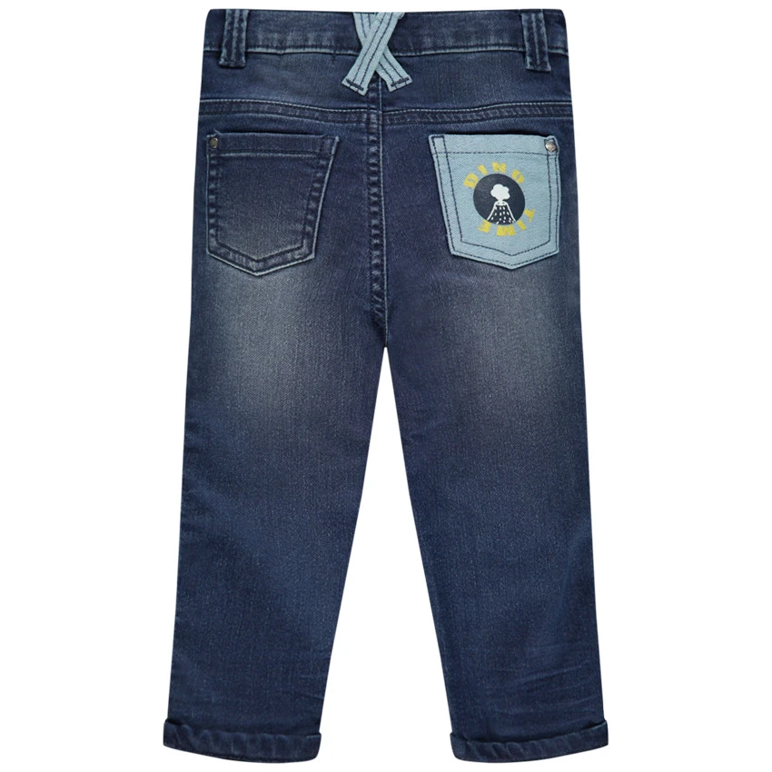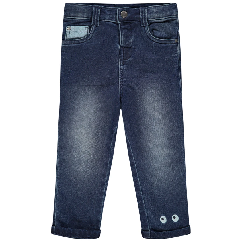 Jean effet used. Doublure en jersey. Taille ajustable de l’intérieur par élastique et boutons. Ceinture à passants avec bouton et braguette zippée. 2 poches cavalières. 1 poche ticket.Yeux brodés sur le bas de la jambe gauche. 2 poches plaquées au dos dont une imprimée.