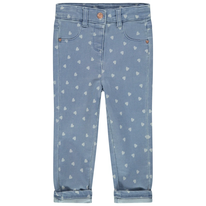 Jean imprimé coeur all-over. Effet used. Taille ajustable de l’intérieur. Ceinture à passants. Finitions rose gold.