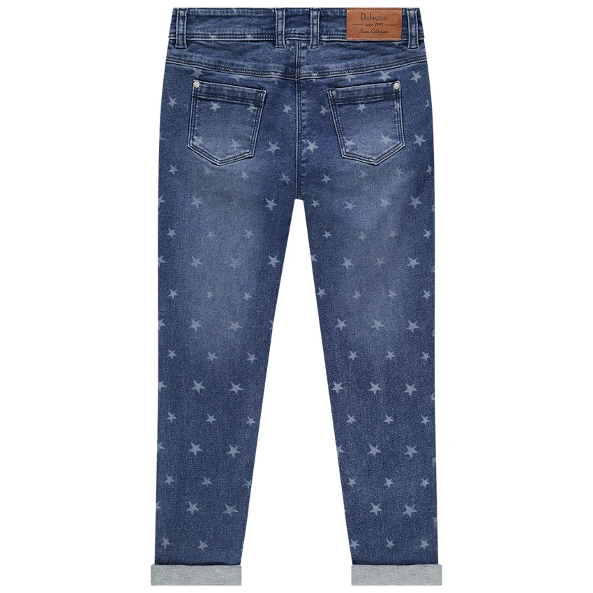Jean effet used coupe slim. Taille à passants ajustable de l’intérieur. Ouverture boutonnée. 2 poches cavalières et 1 poche ticket devant. Etoiles all-over. 2 poches plaquées au dos.