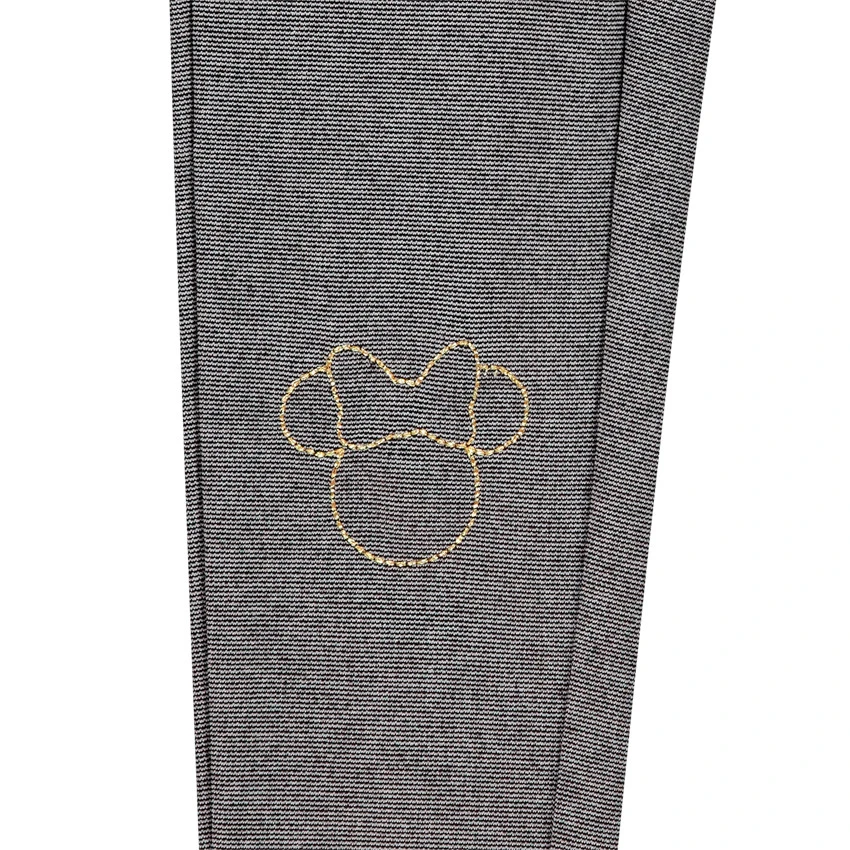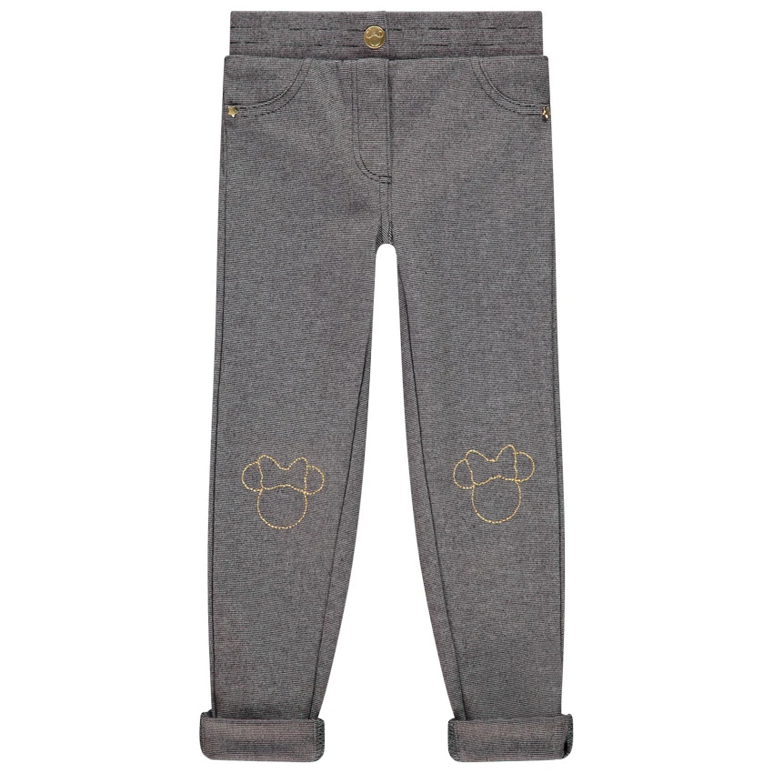 Jegging en maille chinée. Taille élastiquée avec pression sur le devant. 2 poches cavalières devant factices avec rivets forme étoile. Minnie brodée sur les genoux. Passants au dos. Matière stretch.
