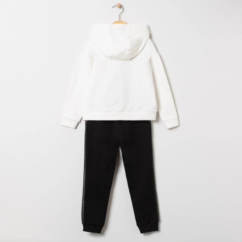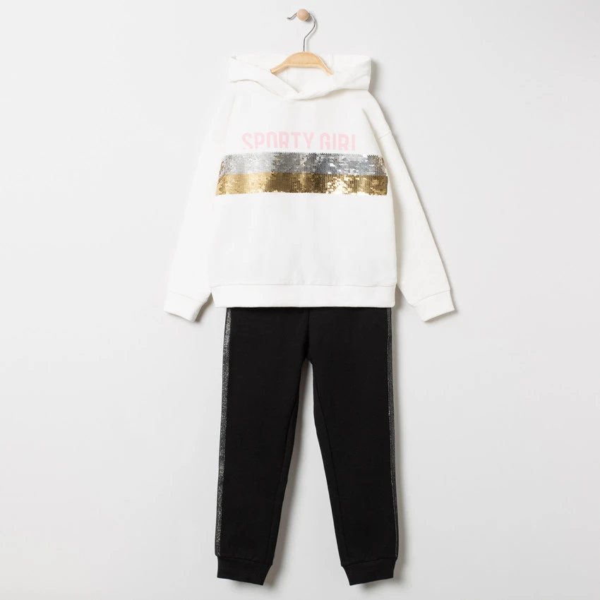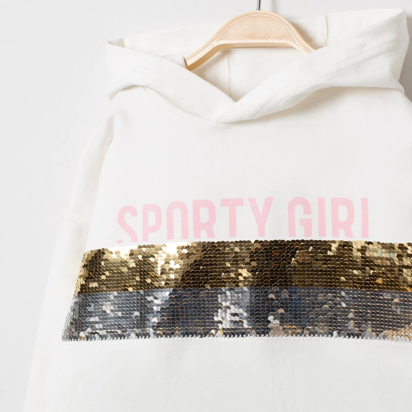 Sweat à capuche uni. Inscription printée et bandes en sequins devant.