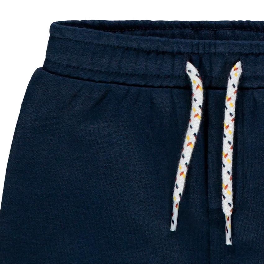 Pantalon en molleton uni. Taille élastiquée à cordons de serrage. Bas des jambes en bord-côte rayé. 2 poches plaquées au dos.