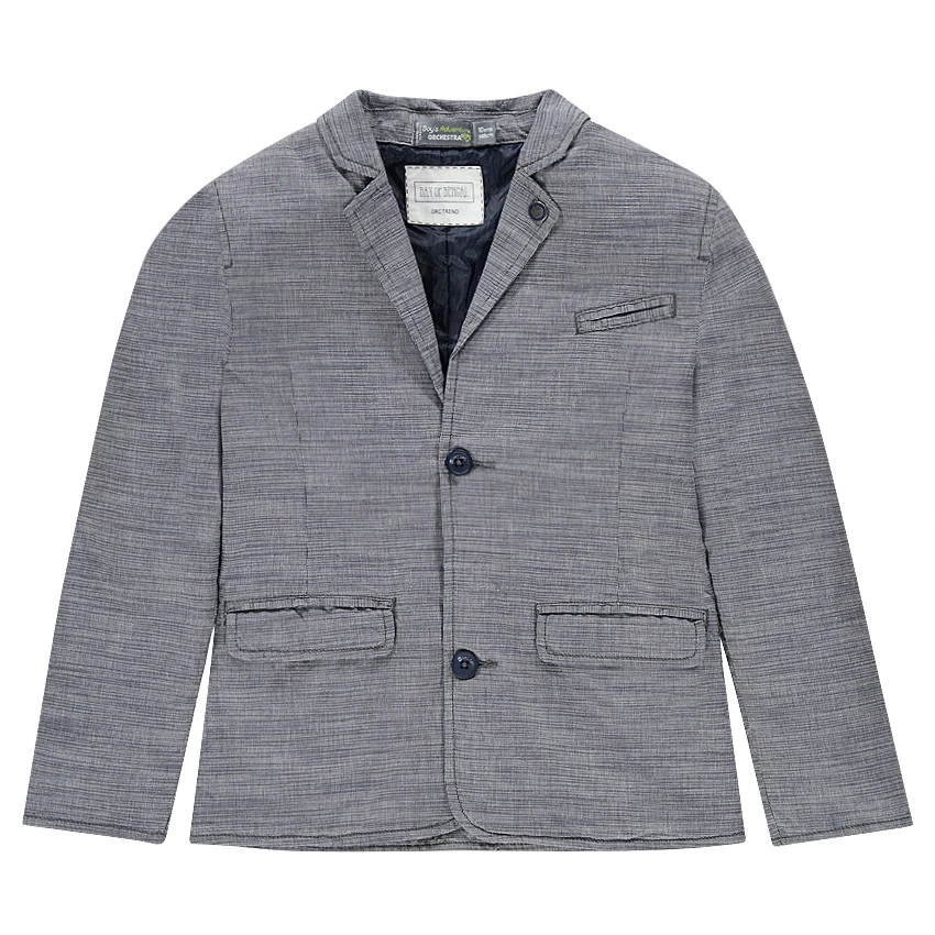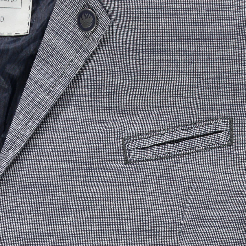 Blazer en coton flammé. Doublure intérieure nylon. Col cranté avec rivet gravé fantaisie. 1 poche passepoilée sur la poitrine. 2 poches à rabat sur le devant. Ouverture boutonnée. Poignets avec 2 boutons.