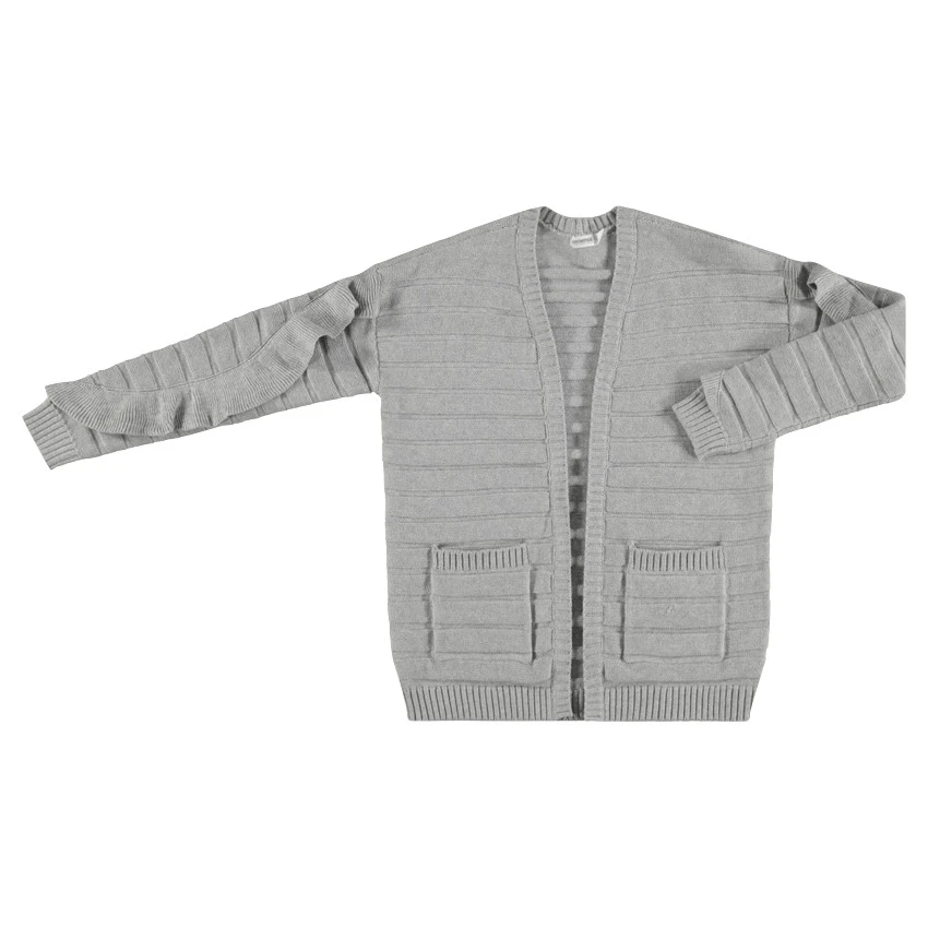 Gilet en tricot reliéfé. Épaules tombantes. Forme loose. Pans sans boutonnage. 2 larges poches plaquées sur le devant. Volants sur les manches. Poignets et base en bord-côte. Dos uni.