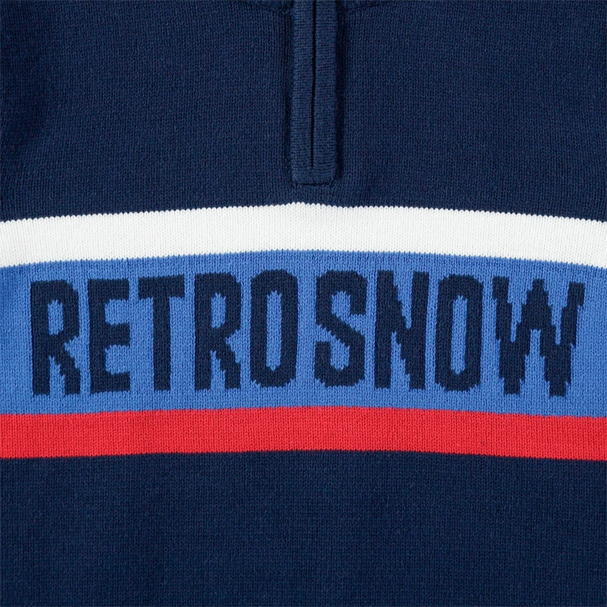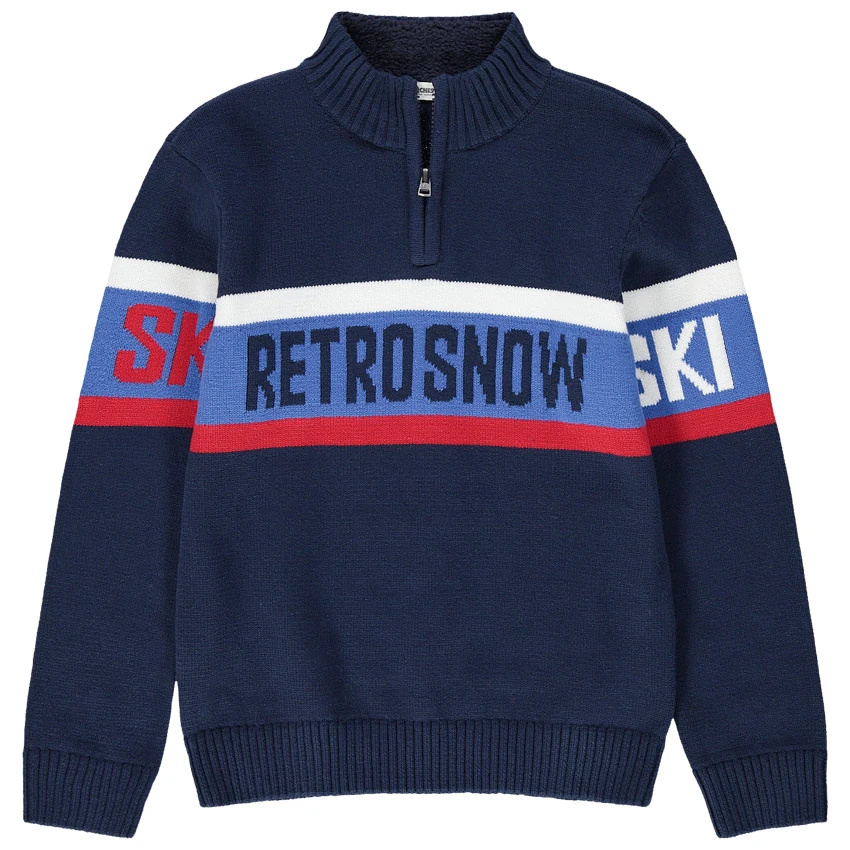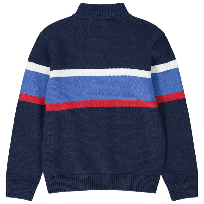 Pull en tricot. Col montant zippé en bord-côte. Bandes et inscriptions contrastées en jacquard. Poignets et base en bord-côte.